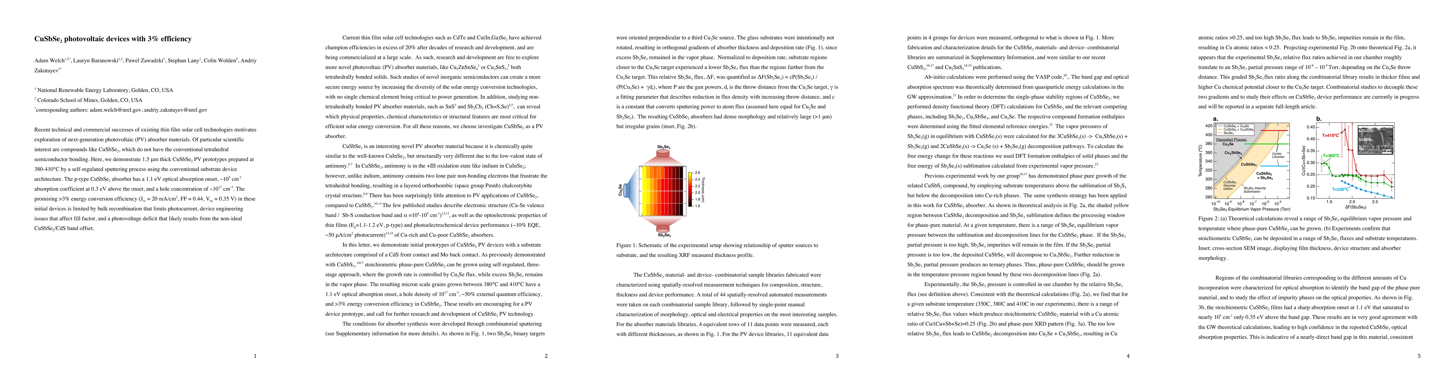 Researchers have developed a photovoltaic device made of CuSbSe2 with an efficiency of over 3%, demonstrating potential for next-generation solar cells. However, the devices' performance is limited by bulk recombination and a band offset between the CuSbSe2 and CdS layers.