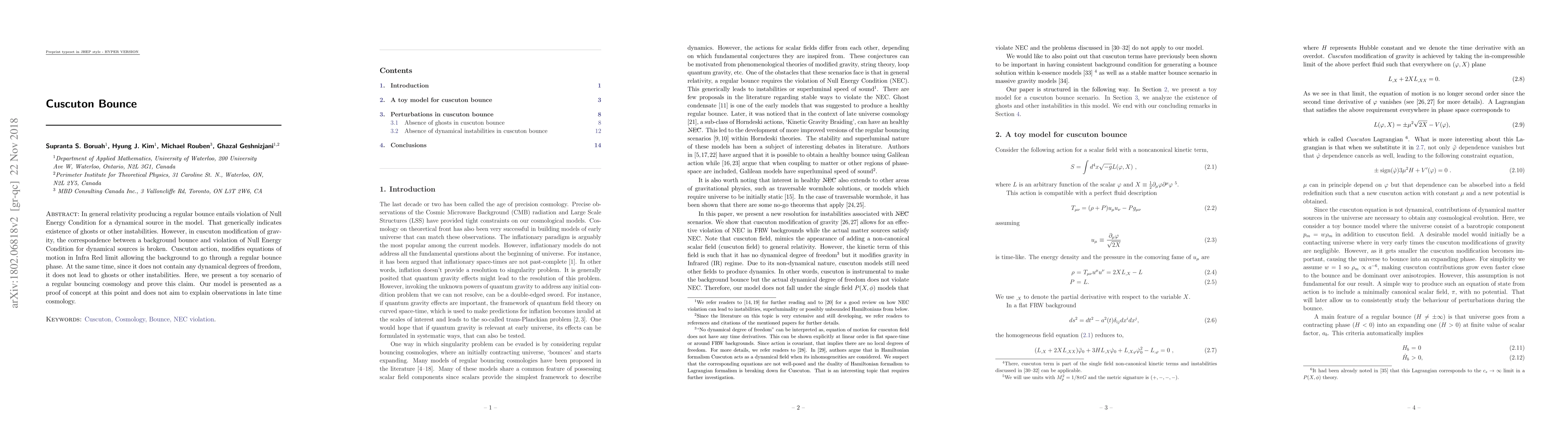 The paper proposes a cuscuton modification of gravity that allows for a regular cosmological bounce without violating the Null Energy Condition, thus avoiding the presence of ghosts or instabilities typically associated with such violations. This model serves as a proof of concept for a bouncing cosmology without dynamical degrees of freedom.