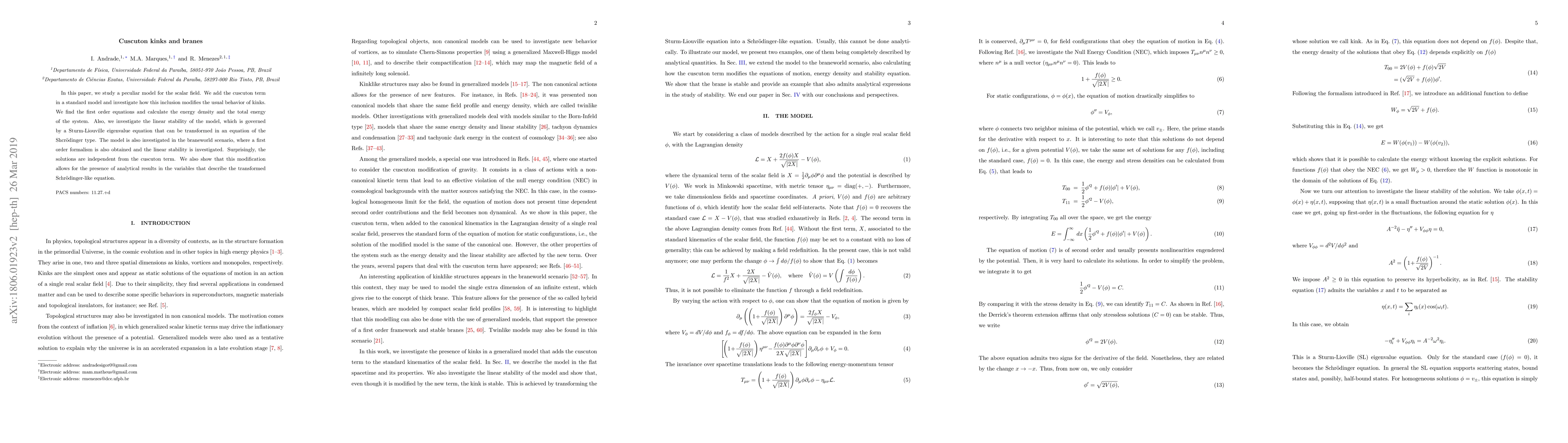 This paper investigates how adding a cuscuton term to a standard model affects kinks, calculating energy density and total energy while studying linear stability in a braneworld scenario.