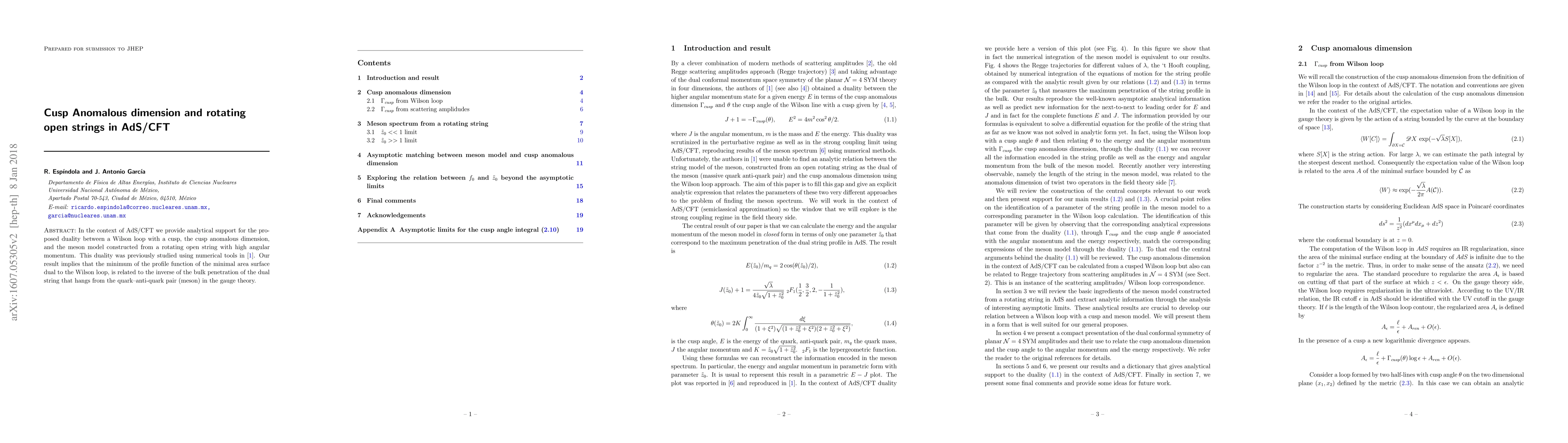 In the context of AdS/CFT we provide analytical support for the proposed duality between a Wilson loop with a cusp, the cusp anomalous dimension, and the meson model constructed from a rotating open string with high angular momentum. This duality was previously studied using numerical tools in [1]. Our result implies that the minimum of the profile function of the minimal area surface dual to the Wilson loop, is related to the inverse of the bulk penetration of the dual string that hangs from the quark--anti-quark pair (meson) in the gauge theory.