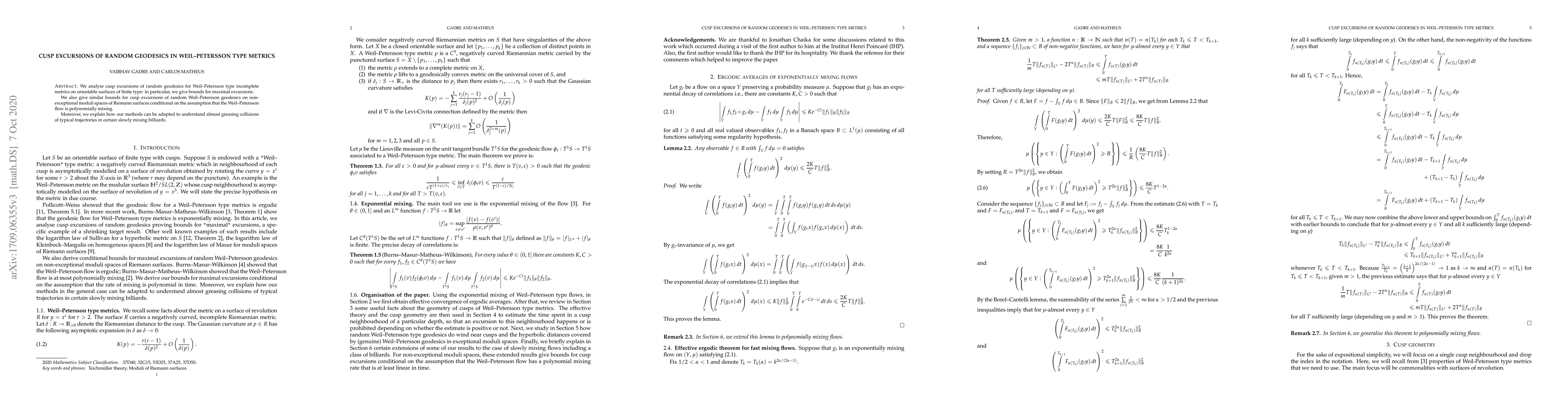 This paper analyzes cusp excursions of random geodesics in Weil-Petersson type metrics on surfaces, providing bounds for maximal excursions. It also extends these results to non-exceptional moduli spaces under polynomial mixing conditions and discusses applications to understanding collisions in slowly mixing billiards.