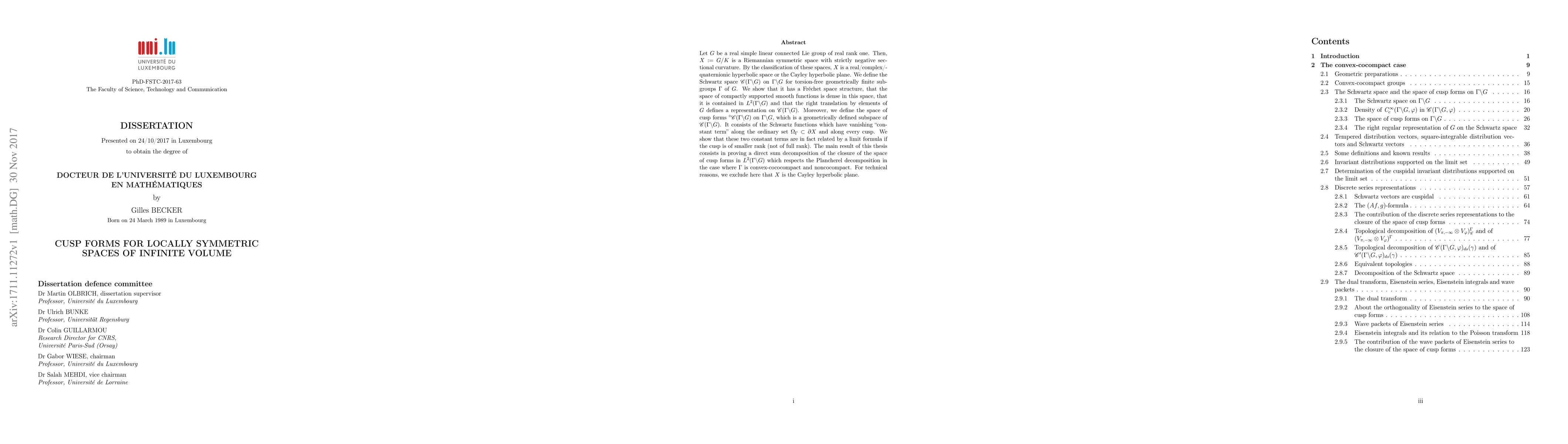 This paper defines and analyzes the Schwartz space and the space of cusp forms for locally symmetric spaces of infinite volume. It proves a direct sum decomposition of the closure of cusp forms in $L^2(\Gamma \backslash G)$ for torsion-free geometrically finite subgroups $\Gamma$ of a real simple linear connected Lie group $G$.