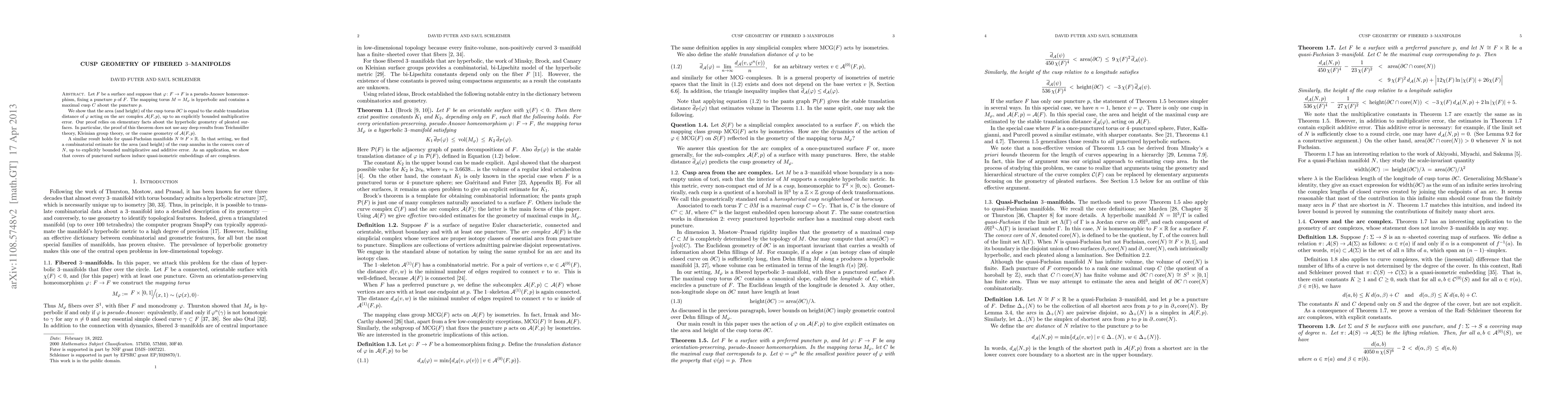 Let F be a surface and suppose that \phi: F -> F is a pseudo-Anosov homeomorphism fixing a puncture p of F. The mapping torus M = M_\phi is hyperbolic and contains a maximal cusp C about the puncture p. We show that the area (and height) of the cusp torus bounding C is equal to the stable translation distance of \phi acting on the arc complex A(F,p), up to an explicitly bounded multiplicative error. Our proof relies on elementary facts about the hyperbolic geometry of pleated surfaces. In particular, the proof of this theorem does not use any deep results in Teichmueller theory, Kleinian group theory, or the coarse geometry of A(F,p). A similar result holds for quasi-Fuchsian manifolds N = (F x R). In that setting, we find a combinatorial estimate for the area (and height) of the cusp annulus in the convex core of N, up to an explicitly bounded multiplicative and additive error. As an application, we show that covers of punctured surfaces induce quasi-isometric embeddings of arc complexes.