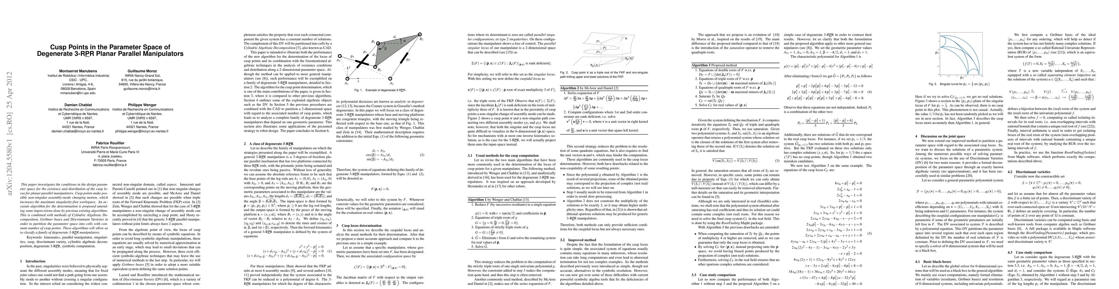 This paper proposes an accurate algorithm for determining cusp points in the parameter space of degenerate 3-RPR planar parallel manipulators, utilizing Cylindric Algebraic Decomposition, Gröbner bases, and Discriminant Varieties to partition the parameter space and classify the manipulators. The cusp points enable non-singular assembly-mode changes, enhancing the singularity-free workspace.