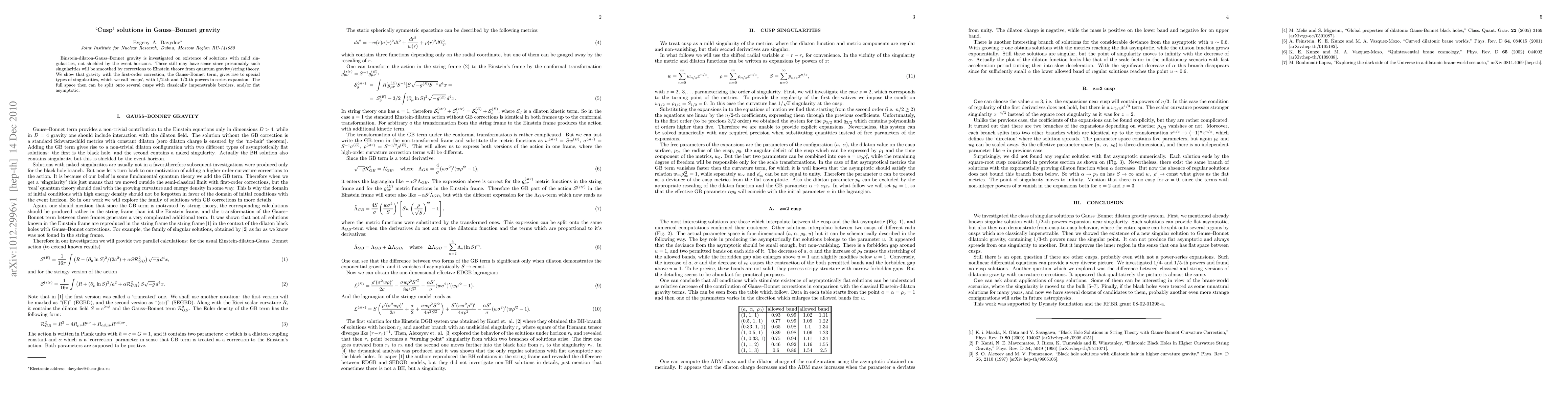 Einstein-dilaton-Gauss-Bonnet gravity is investigated on existence of solutions with mild singularities, not shielded by the event horizons. These still may have sense since presumably such singularities will be smoothed by corrections to Einstein theory from quantum gravity/string theory. We show that gravity with the first-order correction, the Gauss--Bonnet term, gives rise to special types of singularities, which we call 'cusps', with 1/2-th and 1/3-th powers in series expansion. The full space then can be split onto several cusps with classically impenetrable borders, and/or flat asymptotic.