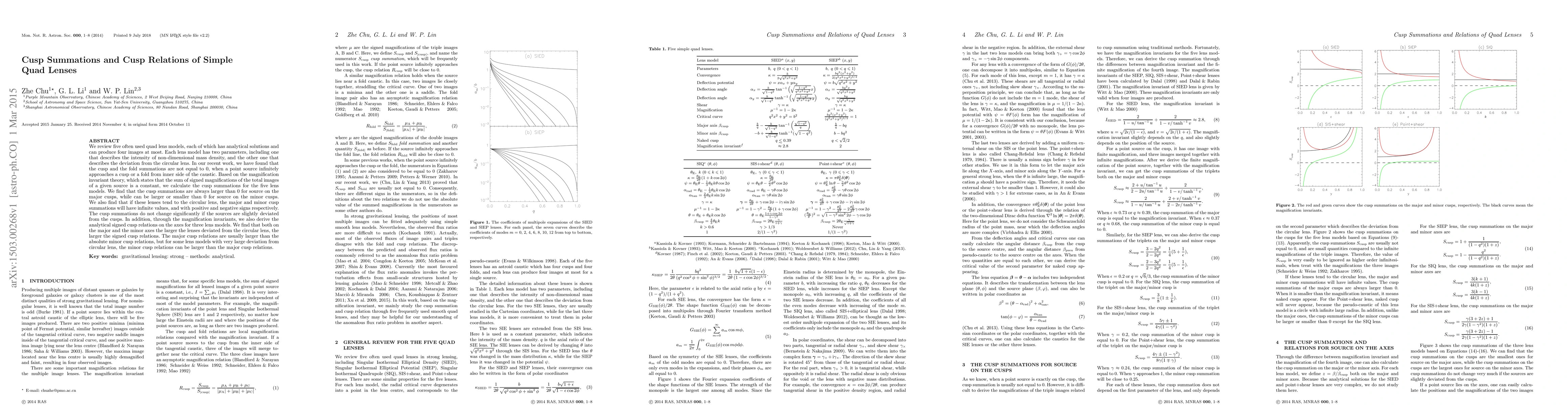 This paper analyzes five quad lens models using cusp summations and magnification invariant theory, finding that cusp summations are always positive for sources on major cusps and can change signs for minor cusps. As lenses approach circularity, cusp summations tend to infinity with specific signs. Signed cusp relations on axes are derived, showing that deviations from circularity increase their magnitude, with major cusp relations generally larger but sometimes surpassed by minor ones in highly deformed lenses.