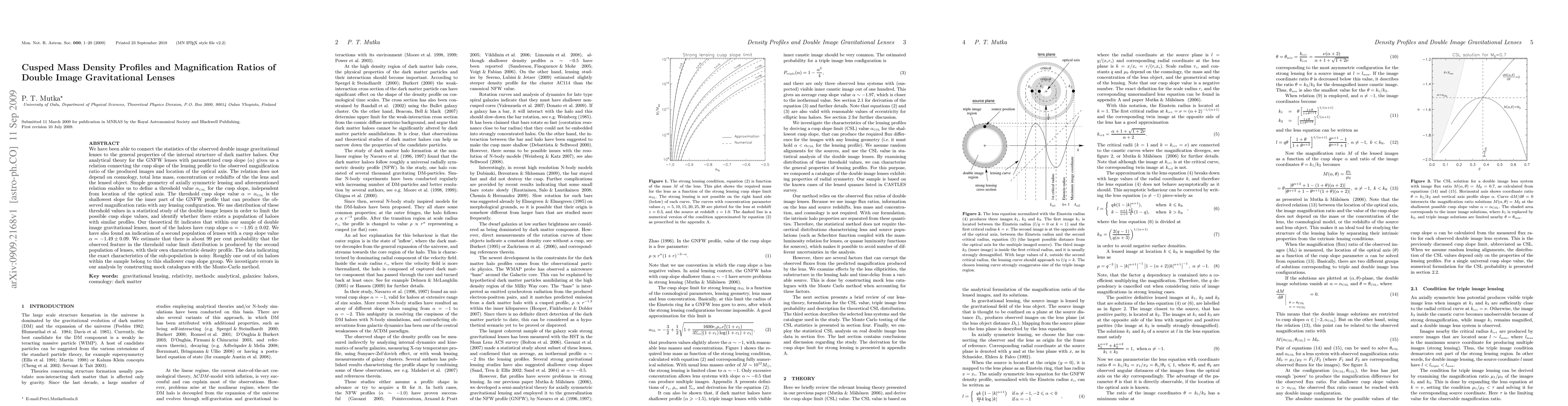 This paper connects the observed statistics of double image gravitational lenses to the internal structure of dark matter haloes, proposing a relation between the cusp slope of lensing profiles and the observed magnification ratio. The study finds that most haloes have a cusp slope of α=-1.95 ± 0.02, with a secondary population showing a slope of α=-1.49 ± 0.09, suggesting distinct density profiles.