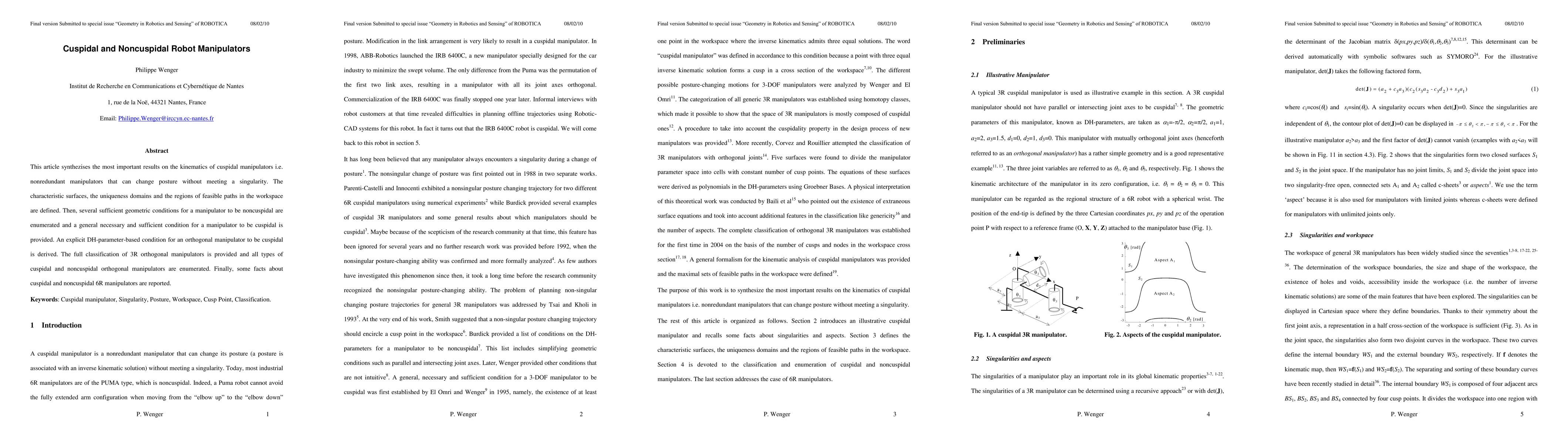This article synthezises the most important results on the kinematics of cuspidal manipulators i.e. nonredundant manipulators that can change posture without meeting a singularity. The characteristic surfaces, the uniqueness domains and the regions of feasible paths in the workspace are defined. Then, several sufficient geometric conditions for a manipulator to be noncuspidal are enumerated and a general necessary and sufficient condition for a manipulator to be cuspidal is provided. An explicit DH-parameter-based condition for an orthogonal manipulator to be cuspidal is derived. The full classification of 3R orthogonal manipulators is provided and all types of cuspidal and noncuspidal orthogonal manipulators are enumerated. Finally, some facts about cuspidal and noncuspidal 6R manipulators are reported.
