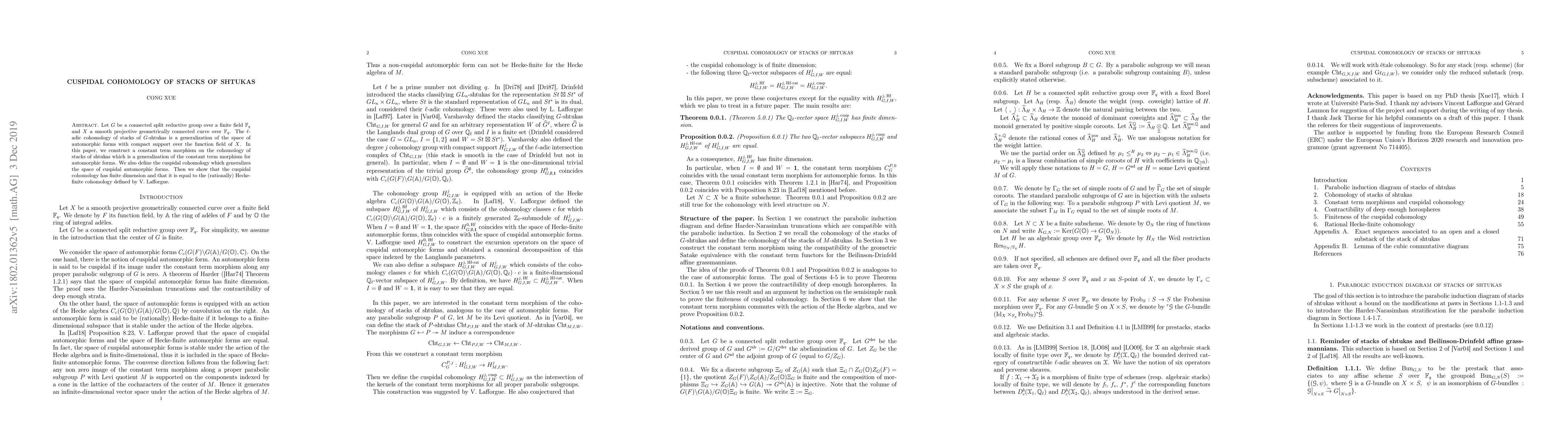Let $G$ be a connected split reductive group over a finite field ${\mathbb F}_q$ and $X$ a smooth projective geometrically connected curve over ${\mathbb F}_q$. The $\ell$-adic cohomology of stacks of $G$-shtukas is a generalization of the space of automorphic forms with compact support over the function field of $X$. In this paper, we construct a constant term morphism on the cohomology of stacks of shtukas which is a generalization of the constant term morphism for automorphic forms. We also define the cuspidal cohomology which generalizes the space of cuspidal automorphic forms. Then we show that the cuspidal cohomology has finite dimension and that it is equal to the (rationally) Hecke-finite cohomology defined by V. Lafforgue.
