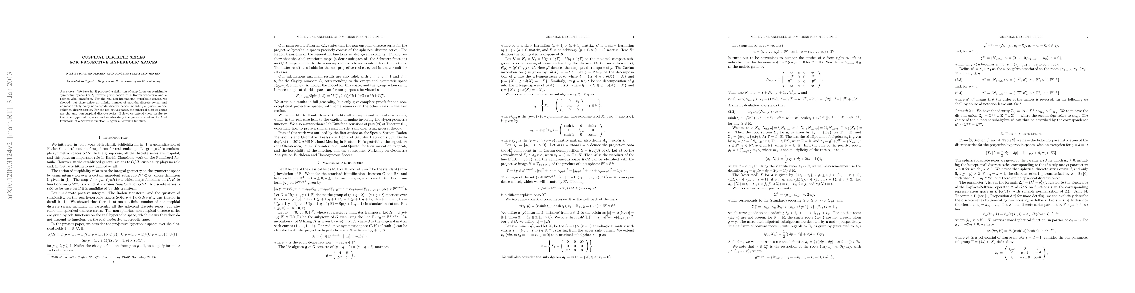 We have in [1] proposed a definition of cusp forms on semisimple symmetric spaces $G/H$, involving the notion of a Radon transform and a related Abel transform. For the real non-Riemannian hyperbolic spaces, we showed that there exists an infinite number of cuspidal discrete series, and at most finitely many non-cuspidal discrete series, including in particular the spherical discrete series. For the projective spaces, the spherical discrete series are the only non-cuspidal discrete series. Below, we extend these results to the other hyperbolic spaces, and we also study the question of when the Abel transform of a Schwartz function is again a Schwartz function.