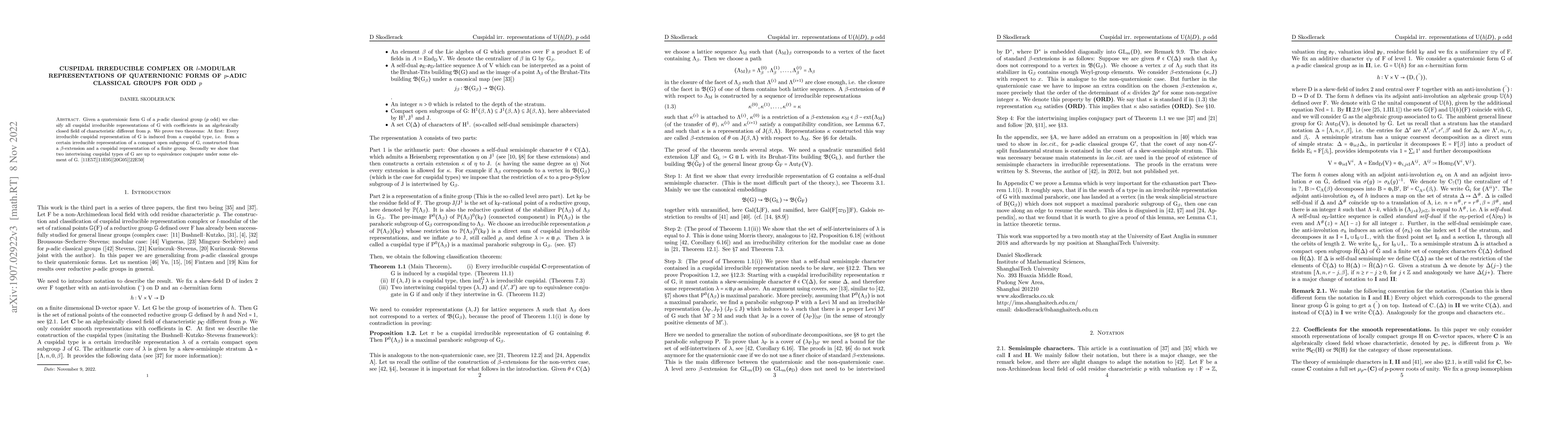 Summary: The paper classifies cuspidal irreducible representations of quaternionic forms of p-adic classical groups for odd primes p, proving that every such representation is induced from a cuspidal type and that equivalent cuspidal types are conjugate under some element of the group.