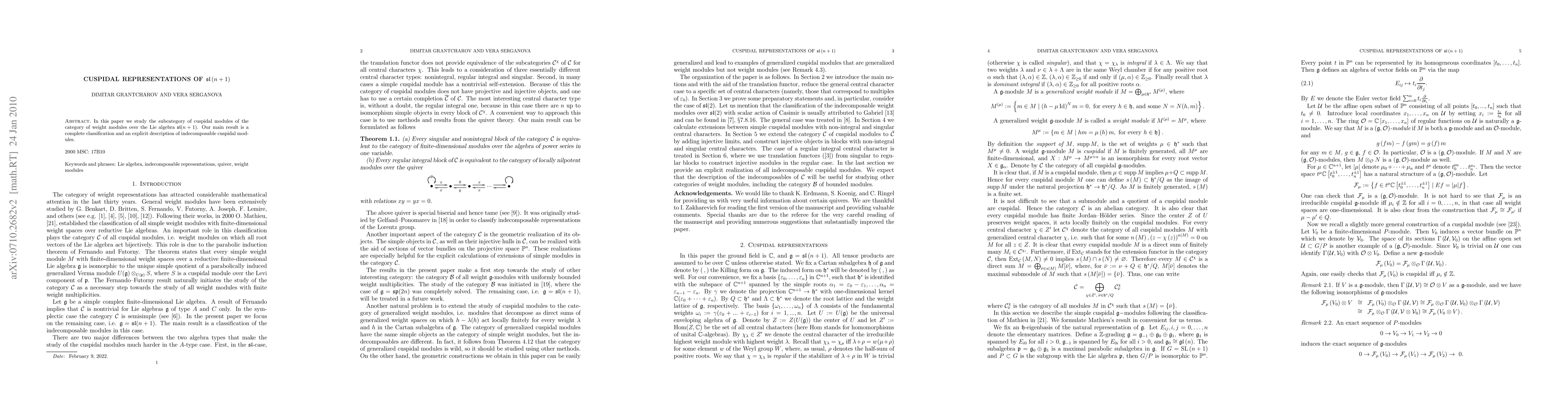 This paper classifies and explicitly describes the indecomposable cuspidal modules within the category of weight modules over the Lie algebra sl(n+1), providing a complete understanding of this subcategory. The results offer detailed insights into the structure and properties of these modules.