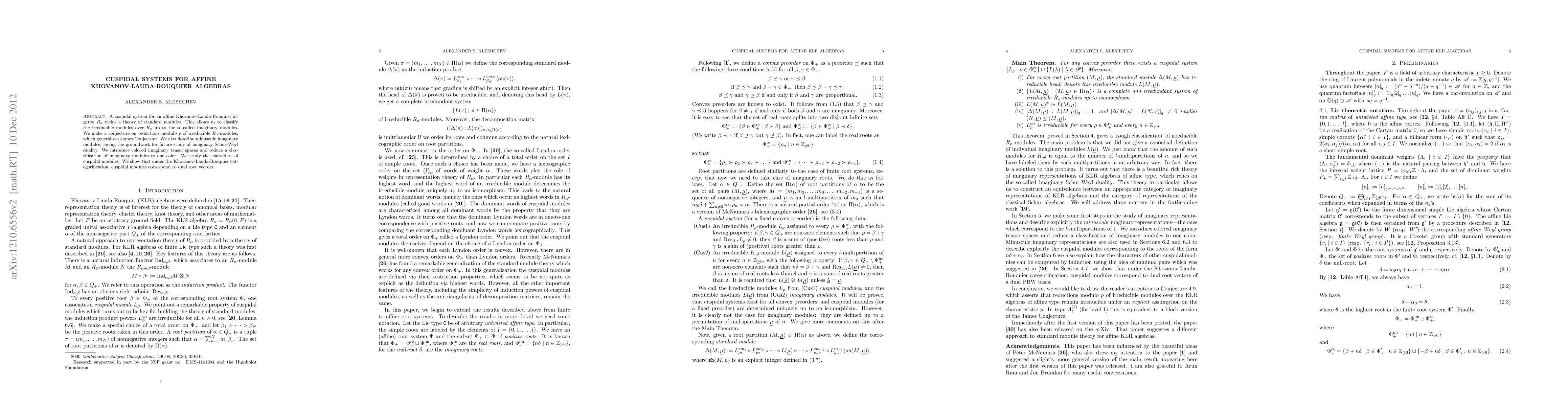 A cuspidal system for an affine Khovanov-Lauda-Rouquier algerba $R_\al$ yields a theory of standard modules. This allows us to classify the irreducible modules over $R_\al$ up to the so-called imaginary modules. We make a conjecture on reductions modulo $p$ of irreducible $R_\al$-modules, which generalizes James Conjecture. We also describe minuscule imaginary modules, laying the groundwork for future study of imaginary Schur-Weyl duality. We introduce colored imaginary tensor spaces and reduce a classification of imaginary modules to one color. We study the characters of cuspidal modules. We show that under the Khovanov-Lauda-Rouquier categorification, cuspidal modules correspond to dual root vectors.