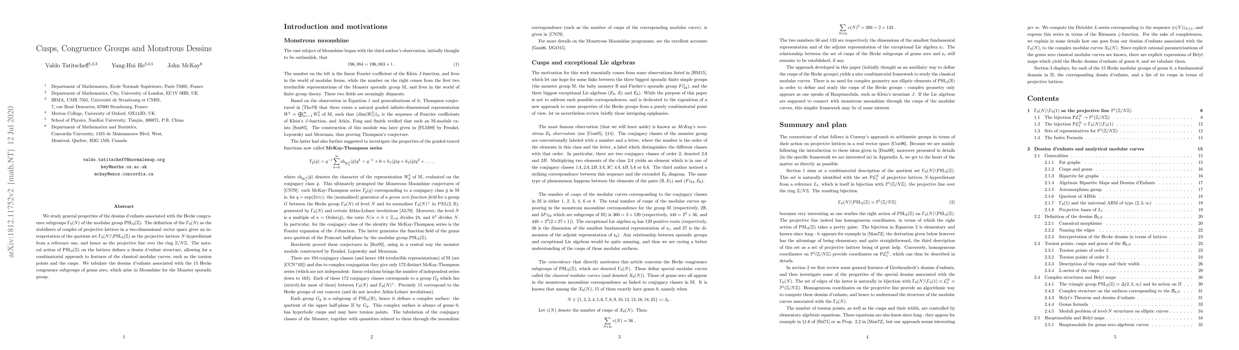 We study general properties of the dessins d'enfants associated with the Hecke congruence subgroups $\Gamma_0(N)$ of the modular group $\mathrm{PSL}_2(\mathbb{R})$. The definition of the $\Gamma_0(N)$ as the stabilisers of couples of projective lattices in a two-dimensional vector space gives an interpretation of the quotient set $\Gamma_0(N)\backslash\mathrm{PSL}_2(\mathbb{R})$ as the projective lattices $N$-hyperdistant from a reference one, and hence as the projective line over the ring $\mathbb{Z}/N\mathbb{Z}$. The natural action of $\mathrm{PSL}_2(\mathbb{R})$ on the lattices defines a dessin d'enfant structure, allowing for a combinatorial approach to features of the classical modular curves, such as the torsion points and the cusps. We tabulate the dessins d'enfants associated with the $15$ Hecke congruence subgroups of genus zero, which arise in Moonshine for the Monster sporadic group.