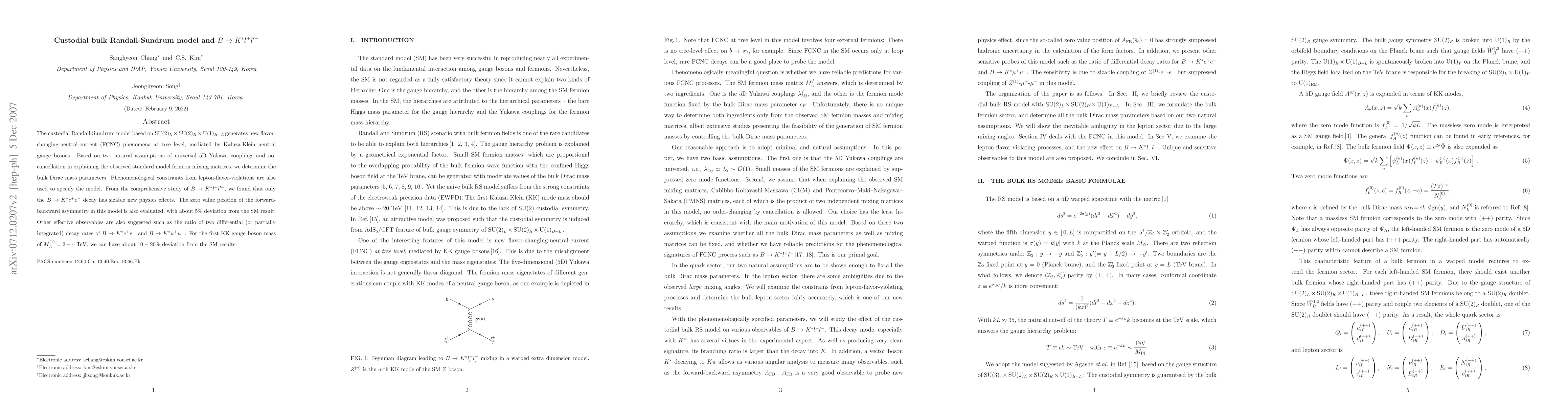 This paper explores the custodial Randall-Sundrum model's impact on B->K* l+ l'- decays, finding that B->K*ee exhibits significant new physics effects due to tree-level FCNC mediated by Kaluza-Klein gauge bosons. The model predicts about 5% deviation in the forward-backward asymmetry and suggests the ratio of B->K*ee and B->K*mu mu decays as a further observable.