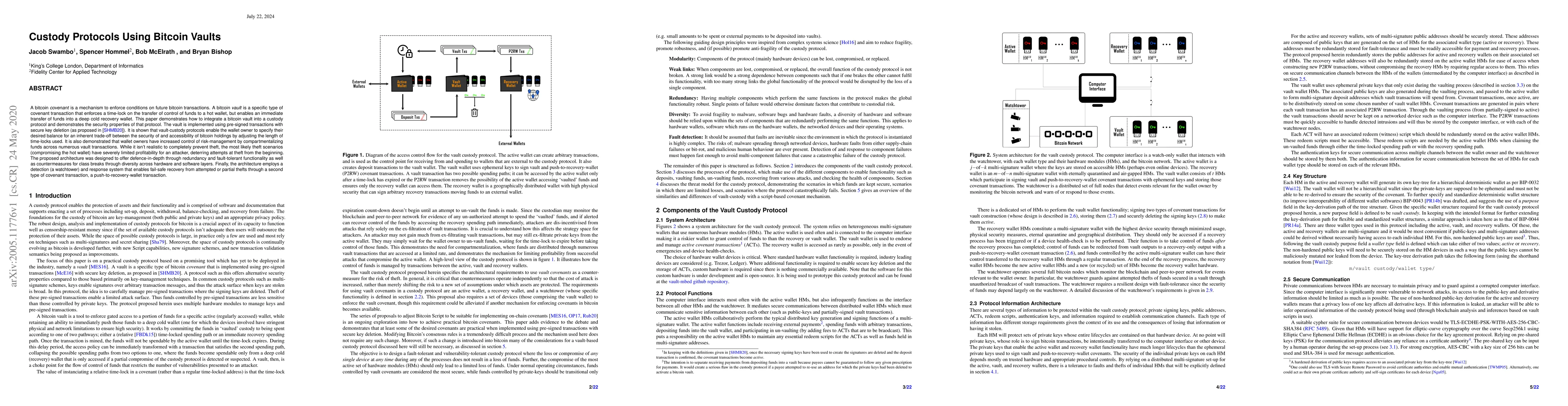 A new bitcoin custody protocol using Bitcoin Vaults offers increased security and control for wallet owners, with a trade-off between security and accessibility, while employing defence-in-depth measures to prevent thefts.