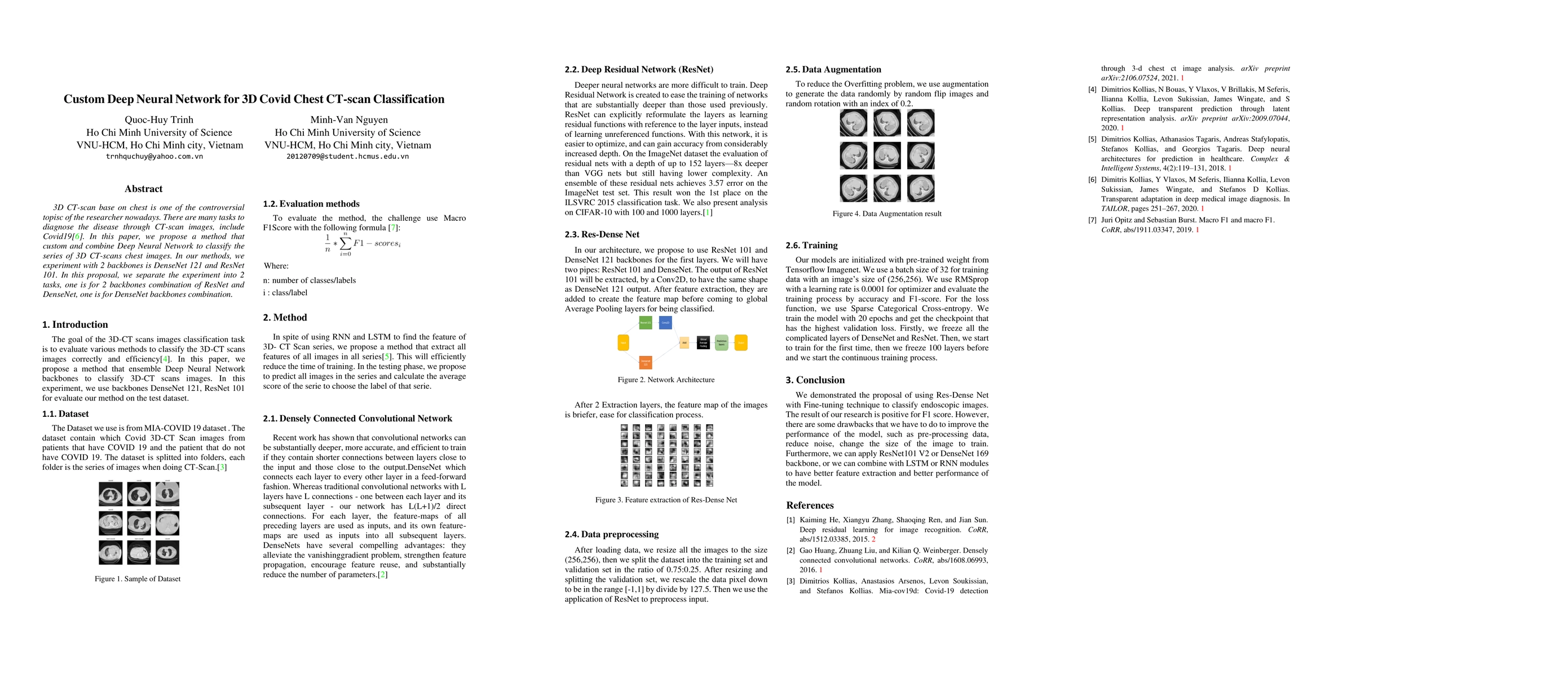 3D CT-scan base on chest is one of the controversial topisc of the researcher nowadays. There are many tasks to diagnose the disease through CT-scan images, include Covid19. In this paper, we propose a method that custom and combine Deep Neural Network to classify the series of 3D CT-scans chest images. In our methods, we experiment with 2 backbones is DenseNet 121 and ResNet 101. In this proposal, we separate the experiment into 2 tasks, one is for 2 backbones combination of ResNet and DenseNet, one is for DenseNet backbones combination.