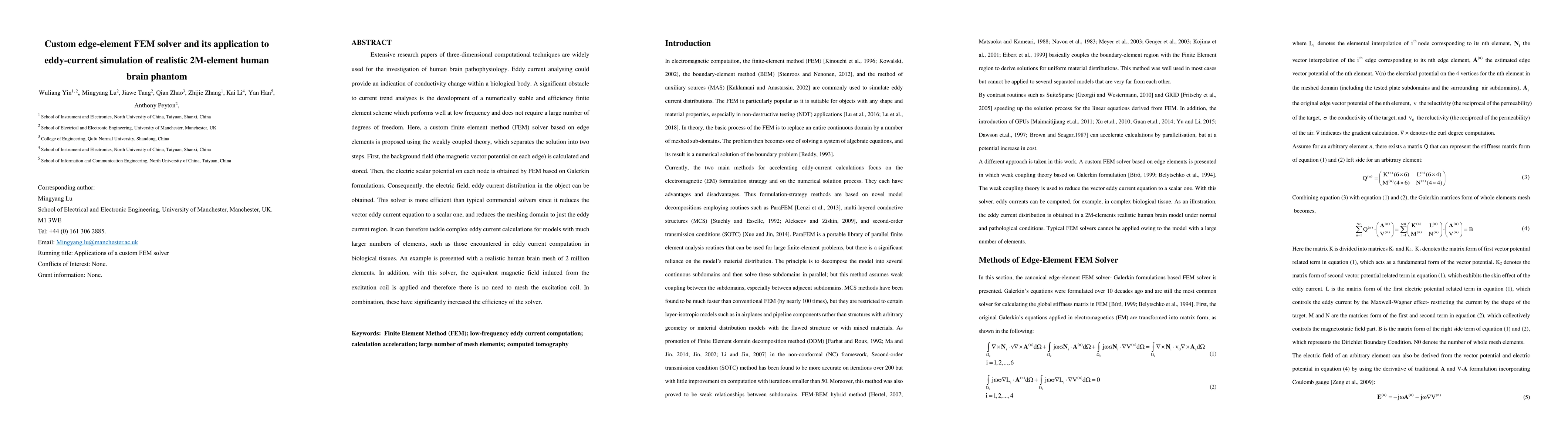 Extensive research papers of three-dimensional computational techniques are widely used for the investigation of human brain pathophysiology. Eddy current analyzing could provide an indication of conductivity change within a biological body. A significant obstacle to current trend analyses is the development of a numerically stable and efficiency-finite element scheme that performs well at low frequency and does not require a large number of degrees of freedom. Here, a custom finite element method (FEM) solver based on edge elements is proposed using the weakly coupled theory, which separates the solution into two steps. First, the background field (the magnetic vector potential on each edge) is calculated and stored. Then, the electric scalar potential on each node is obtained by FEM based on Galerkin formulations. Consequently, the electric field and eddy current distribution in the object can be obtained. This solver is more efficient than typical commercial solvers since it reduces the vector eddy current equation to a scalar one, and reduces the meshing domain to just the eddy current region. It can therefore tackle complex eddy current calculations for models with much larger numbers of elements, such as those encountered in eddy current computation in biological tissues. An example is presented with a realistic human brain mesh of 2 million elements. In addition, with this solver, the equivalent magnetic field induced from the excitation coil is applied, and therefore there is no need to mesh the excitation coil. In combination, these significantly increase the efficiency of the solver.