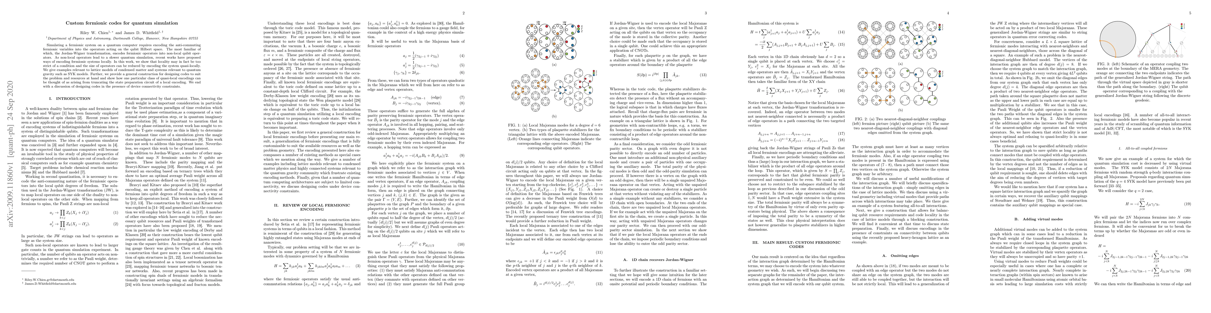 This paper proposes custom quasi-local encodings for simulating fermionic systems on quantum computers, reducing the size of operators compared to traditional non-local methods. It provides a general framework for designing such codes tailored to specific problems and resource constraints, with examples from condensed matter and quantum gravity.