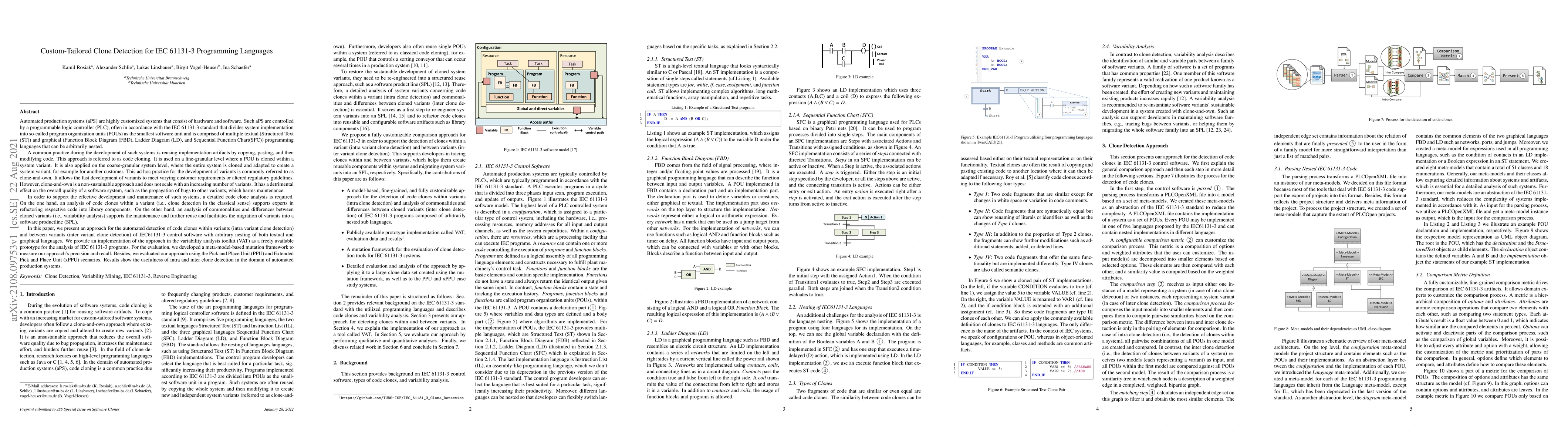 A research paper proposes a method for detecting custom-tailored clone detection in IEC 61131-3 programming languages to improve the development and maintenance of automated production systems. The approach aims to identify common code clones across variants, facilitating reuse and scalability.