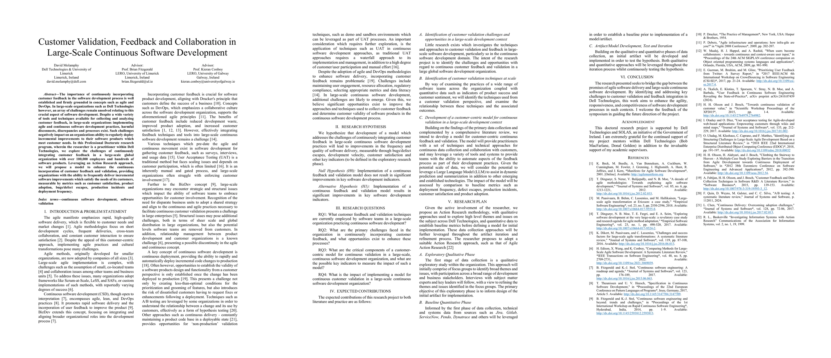 This research aims to enhance the agility, responsiveness, and competitiveness of software development processes in large-scale organizations by addressing key challenges to customer validation and feedback integration.