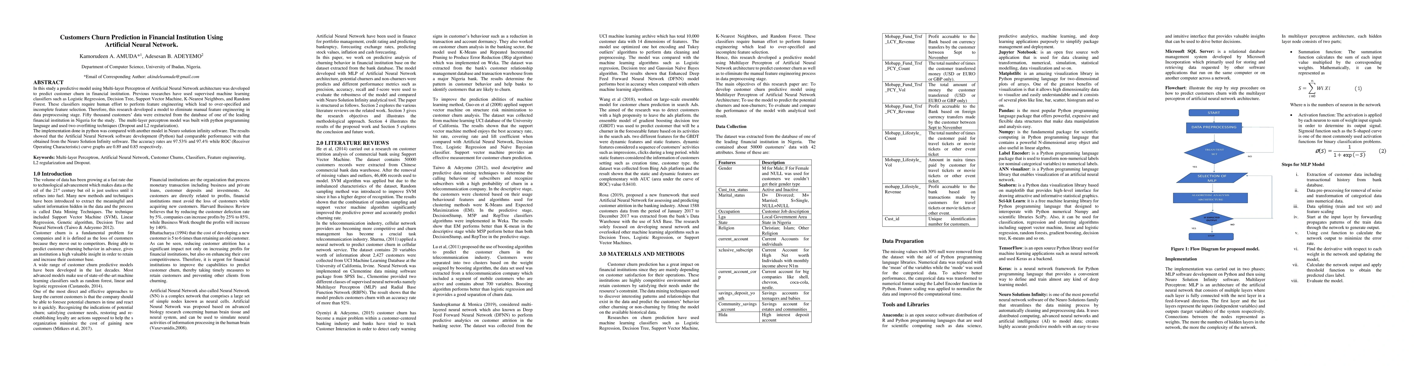 This study developed a predictive model using a Multi-layer Perceptron Artificial Neural Network to predict customer churn in a Nigerian financial institution, eliminating manual feature engineering. The model achieved an accuracy rate of 97.53% and ROC of 0.89, comparable to Neuro Solution Infinity software.