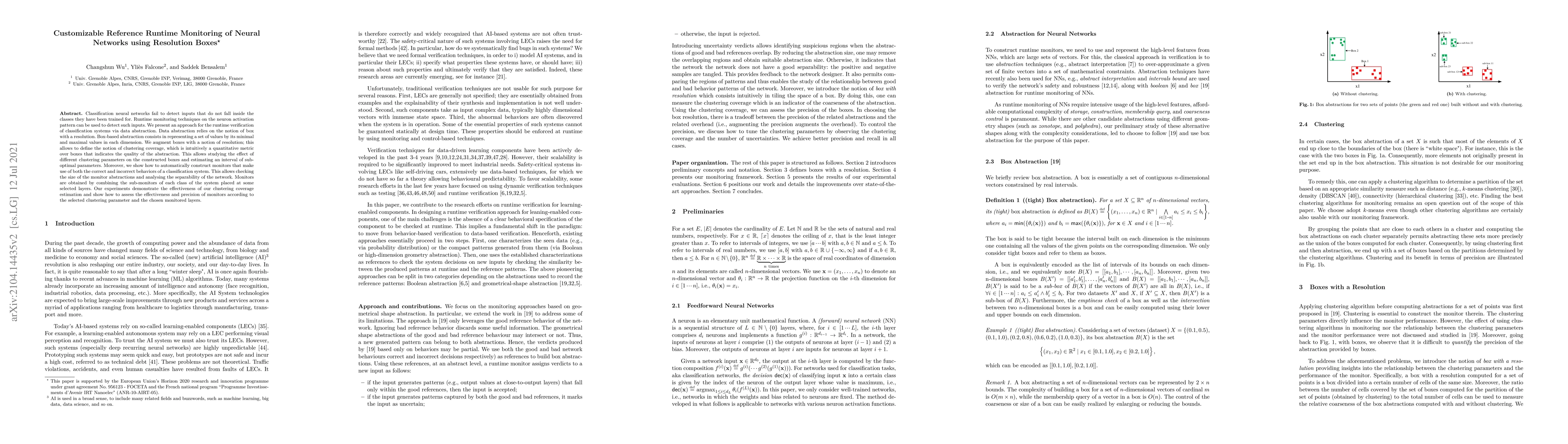 Classification neural networks fail to detect inputs that do not fall inside the classes they have been trained for. Runtime monitoring techniques on the neuron activation pattern can be used to detect such inputs. We present an approach for monitoring classification systems via data abstraction. Data abstraction relies on the notion of box with a resolution. Box-based abstraction consists in representing a set of values by its minimal and maximal values in each dimension. We augment boxes with a notion of resolution and define their clustering coverage, which is intuitively a quantitative metric that indicates the abstraction quality. This allows studying the effect of different clustering parameters on the constructed boxes and estimating an interval of sub-optimal parameters. Moreover, we automatically construct monitors that leverage both the correct and incorrect behaviors of a system. This allows checking the size of the monitor abstractions and analyzing the separability of the network. Monitors are obtained by combining the sub-monitors of each class of the system placed at some selected layers. Our experiments demonstrate the effectiveness of our clustering coverage estimation and show how to assess the effectiveness and precision of monitors according to the selected clustering parameter and monitored layers.