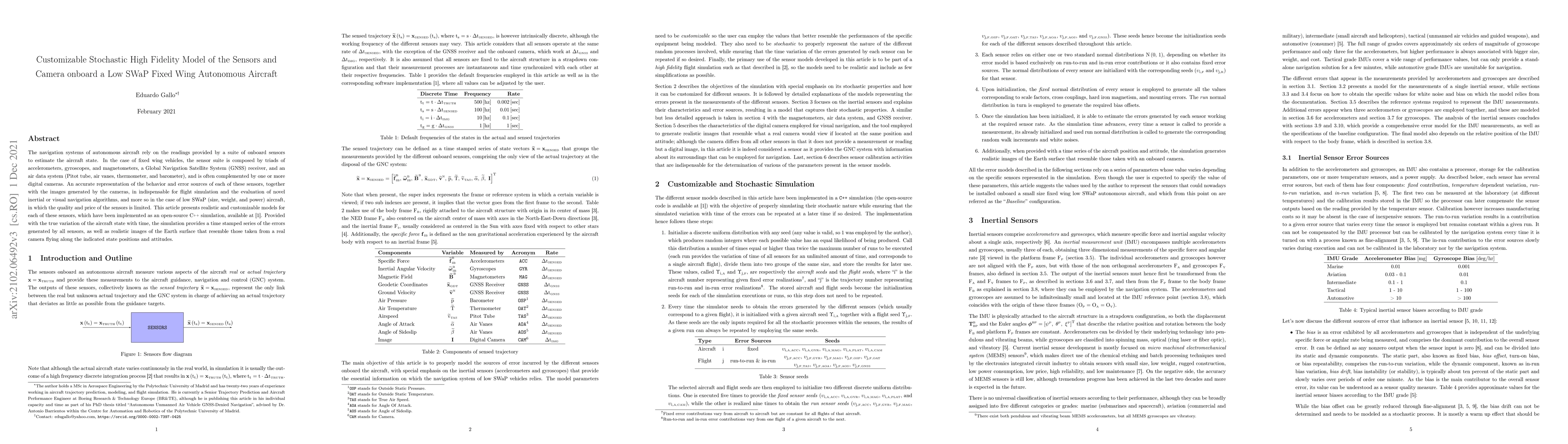 The navigation systems of autonomous aircraft rely on the readings provided by a suite of onboard sensors to estimate the aircraft state. In the case of fixed wing vehicles, the sensor suite is composed by triads of accelerometers, gyroscopes, and magnetometers, a Global Navigation Satellite System (GNSS) receiver, and an air data system (Pitot tube, air vanes, thermometer, and barometer), and is often complemented by one or more digital cameras. An accurate representation of the behavior and error sources of each of these sensors, together with the images generated by the cameras, in indispensable for flight simulation and the evaluation of novel inertial or visual navigation algorithms, and more so in the case of low SWaP (size, weight, and power) aircraft, in which the quality and price of the sensors is limited. This article presents realistic and customizable models for each of these sensors, which have been implemented as an open-source C ++ simulation. Provided with the true variation of the aircraft state with time, the simulation provides a time stamped series of the errors generated by all sensors, as well as realistic images of the Earth surface that resemble those taken from a real camera flying along the indicated state positions and attitudes.