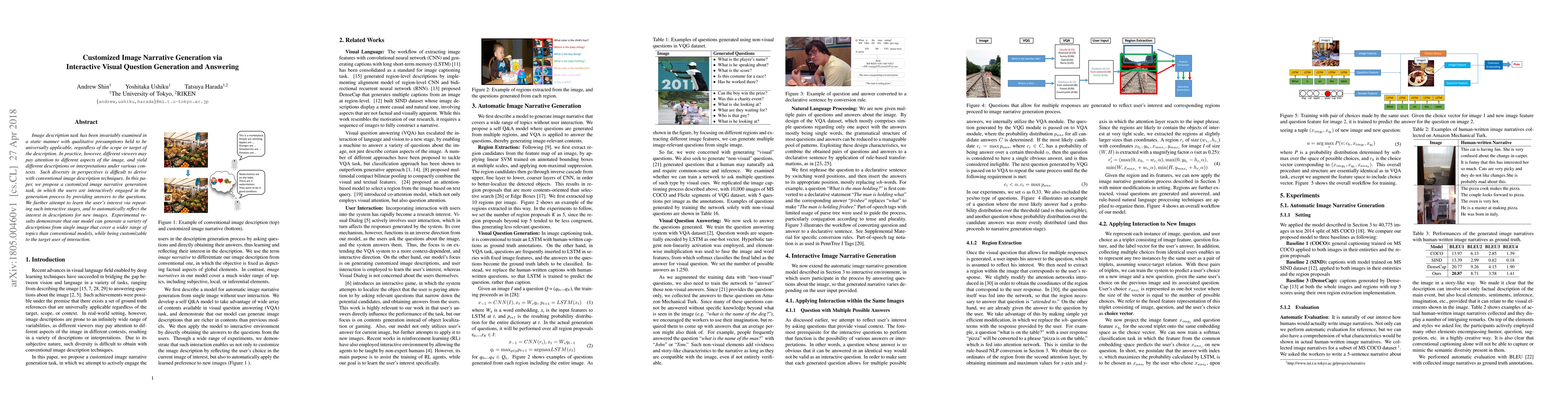This paper proposes a method for generating customized image narratives through interactive visual question generation and answering, allowing users to shape the descriptions based on their interests. The model learns from repeated interactions to adapt descriptions for new images, resulting in more diverse and user-specific narratives compared to conventional static methods.