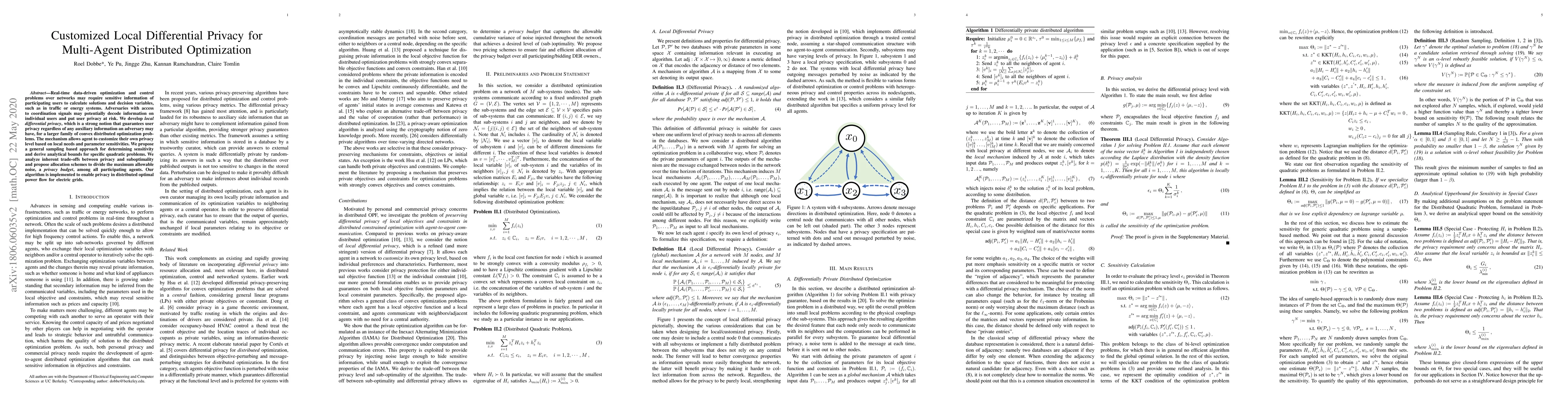 Real-time data-driven optimization and control problems over networks may require sensitive information of participating users to calculate solutions and decision variables, such as in traffic or energy systems. Adversaries with access to coordination signals may potentially decode information on individual users and put user privacy at risk. We develop local differential privacy, which is a strong notion that guarantees user privacy regardless of any auxiliary information an adversary may have, for a larger family of convex distributed optimization problems. The mechanism allows agent to customize their own privacy level based on local needs and parameter sensitivities. We propose a general sampling based approach for determining sensitivity and derive analytical bounds for specific quadratic problems. We analyze inherent trade-offs between privacy and suboptimality and propose allocation schemes to divide the maximum allowable noise, a privacy budget, among all participating agents. Our algorithm is implemented to enable privacy in distributed optimal power flow for electric grids.