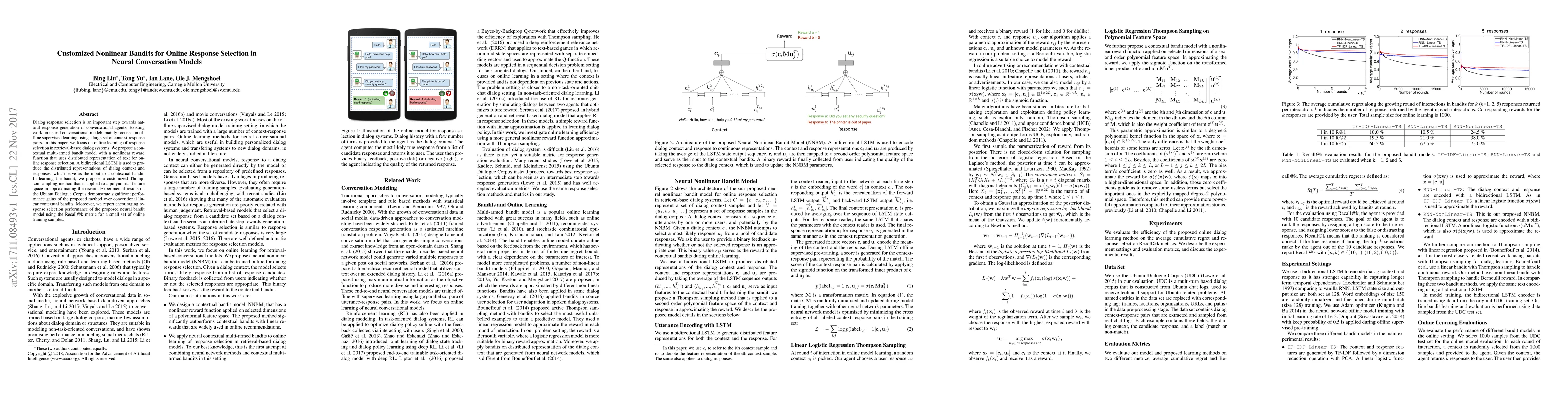 Dialog response selection is an important step towards natural response generation in conversational agents. Existing work on neural conversational models mainly focuses on offline supervised learning using a large set of context-response pairs. In this paper, we focus on online learning of response selection in retrieval-based dialog systems. We propose a contextual multi-armed bandit model with a nonlinear reward function that uses distributed representation of text for online response selection. A bidirectional LSTM is used to produce the distributed representations of dialog context and responses, which serve as the input to a contextual bandit. In learning the bandit, we propose a customized Thompson sampling method that is applied to a polynomial feature space in approximating the reward. Experimental results on the Ubuntu Dialogue Corpus demonstrate significant performance gains of the proposed method over conventional linear contextual bandits. Moreover, we report encouraging response selection performance of the proposed neural bandit model using the Recall@k metric for a small set of online training samples.