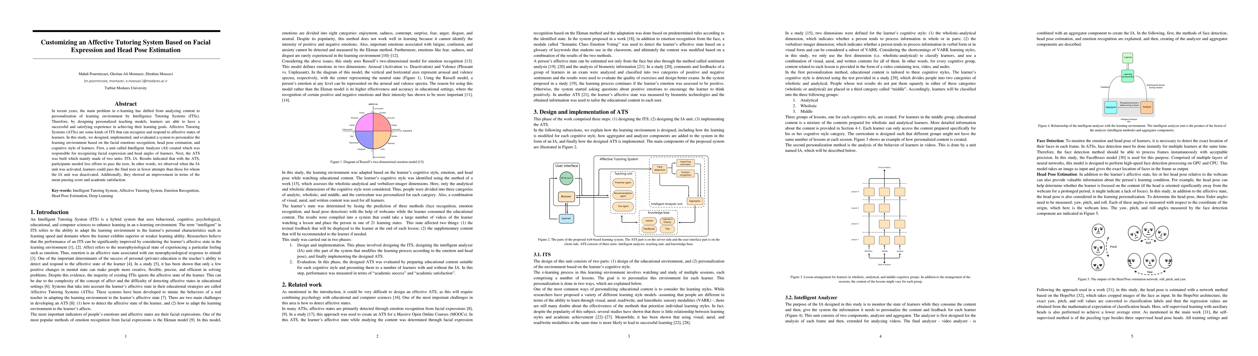 This study developed an Affective Tutoring System (ATS) that personalizes the learning environment using facial emotion recognition and head pose estimation, leading to improved learning outcomes and higher academic satisfaction compared to traditional methods. The Intelligent Analyzer (IA) unit significantly reduced the number of test attempts needed for participants to pass.