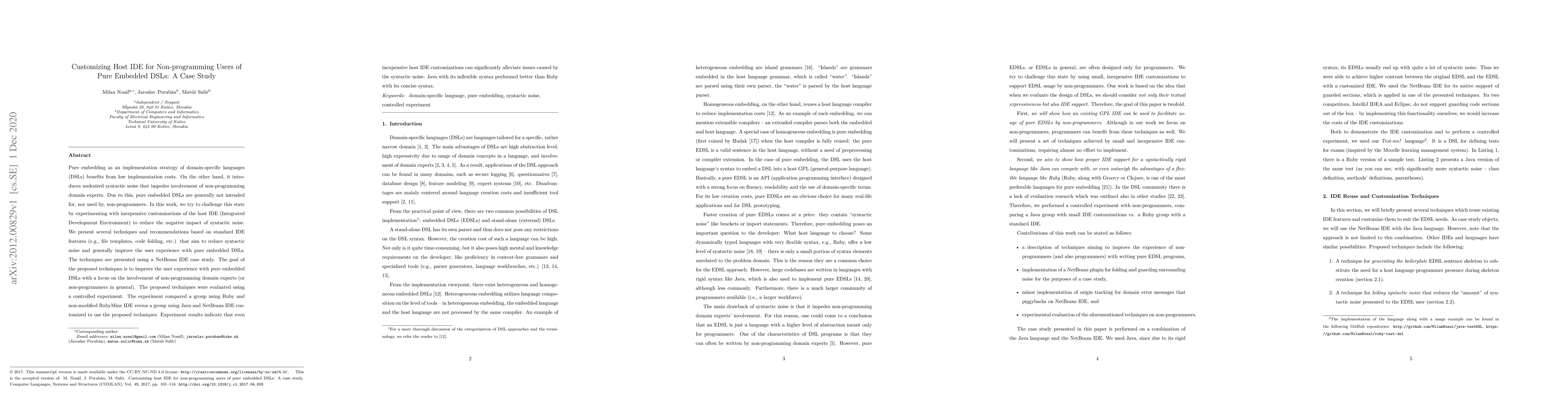 This paper explores inexpensive customizations of the NetBeans IDE to reduce syntactic noise in pure embedded DSLs, aiming to enable non-programming domain experts to use these languages. The study found that customized IDE features significantly improved user experience, with Java performing better than Ruby in the experiment.