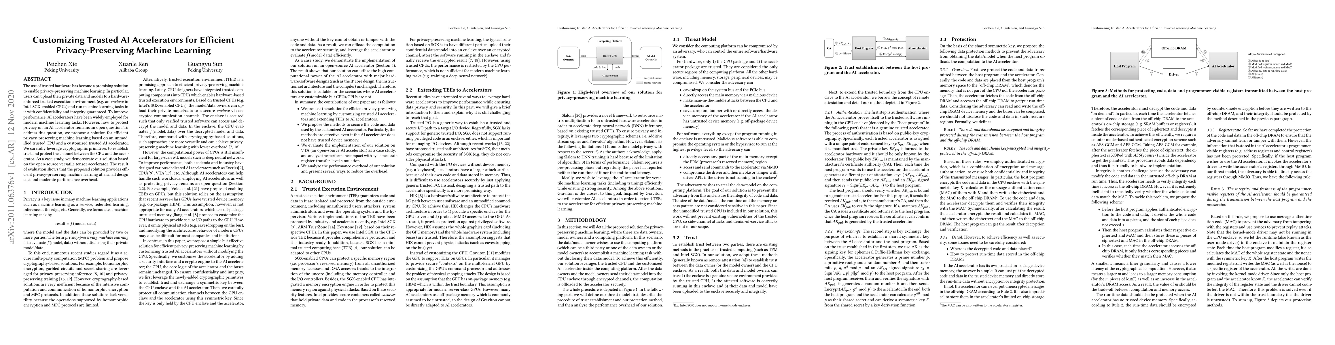 This paper proposes a solution for efficient privacy-preserving machine learning using a customized trusted AI accelerator alongside an unmodified trusted CPU, leveraging cryptographic techniques to enhance security and performance. The evaluation demonstrates the effectiveness of the approach with minimal design cost and moderate performance overhead.