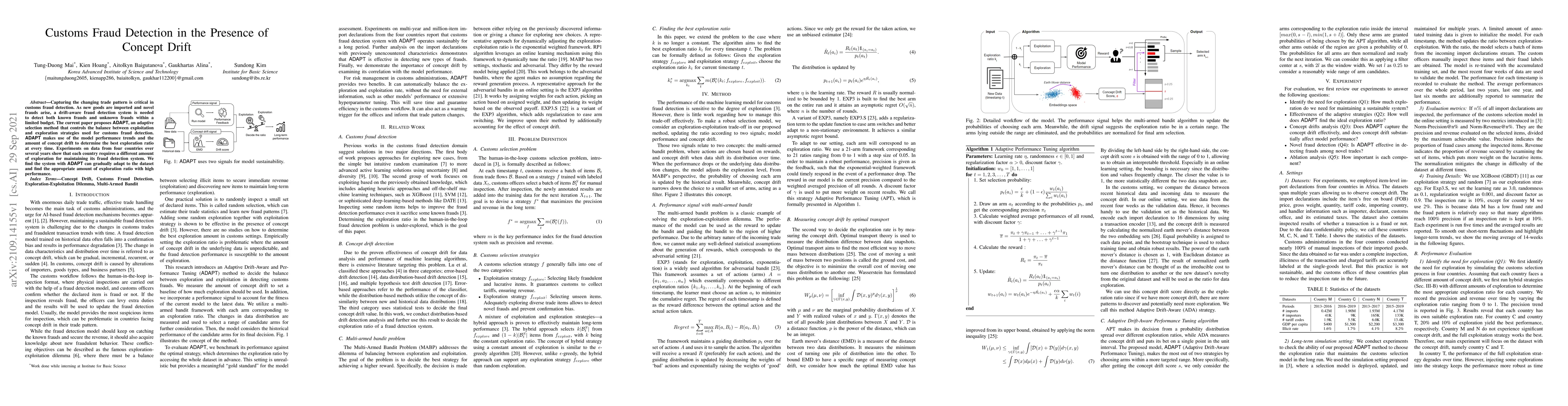 The paper proposes ADAPT, an adaptive method for customs fraud detection that balances exploitation and exploration to handle concept drift. Experiments show ADAPT can effectively adjust its exploration ratio based on model performance trends and concept drift, leading to high-performance fraud detection across different countries.