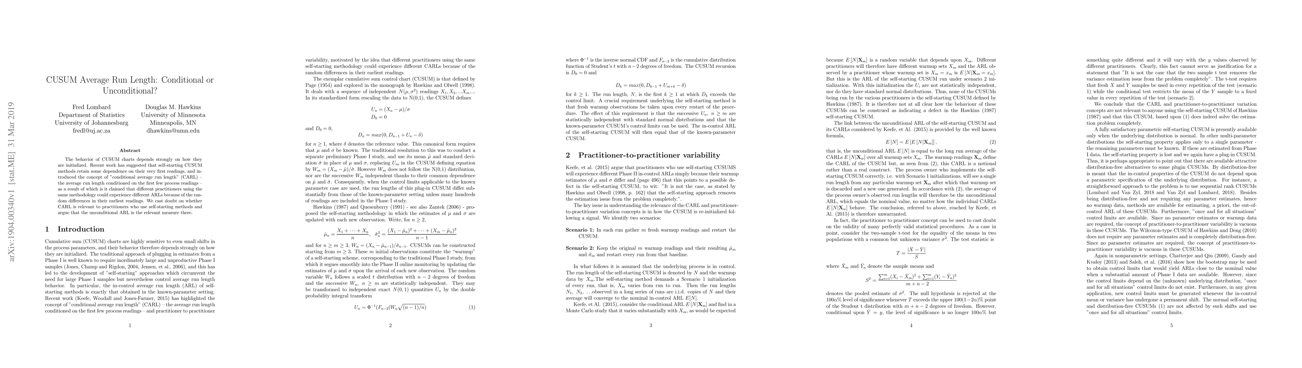 A research paper questions the relevance of the 'conditional average run length' (CARL) metric for self-starting CUSUM charts, arguing instead that unconditional ARL is the relevant measure.