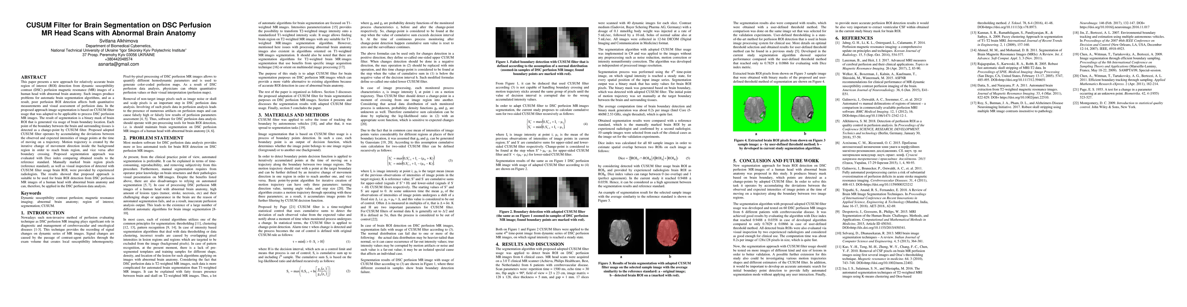 This paper presents a new approach for relatively accurate brain region of interest (ROI) detection from dynamic susceptibility contrast (DSC) perfusion magnetic resonance (MR) images of a human head with abnormal brain anatomy. Such images produce problems for automatic brain segmentation algorithms, and as a result, poor perfusion ROI detection affects both quantitative measurements and visual assessment of perfusion data. In the proposed approach image segmentation is based on CUSUM filter usage that was adapted to be applicable to process DSC perfusion MR images. The result of segmentation is a binary mask of brain ROI that is generated via usage of brain boundary location. Each point of the boundary between the brain and surrounding tissues is detected as a change-point by CUSUM filter. Proposed adopted CUSUM filter operates by accumulating the deviations between the observed and expected intensities of image points at the time of moving on a trajectory. Motion trajectory is created by the iterative change of movement direction inside the background region in order to reach brain region, and vice versa after boundary crossing. Proposed segmentation approach was evaluated with Dice index comparing obtained results to the reference standard. Manually marked brain region pixels (reference standard), as well as visual inspection of detected with CUSUM filter usage brain ROI, were provided by experienced radiologists. The results showed that proposed approach is suitable to be used for brain ROI detection from DSC perfusion MR images of a human head with abnormal brain anatomy and can, therefore, be applied in the DSC perfusion data analysis.