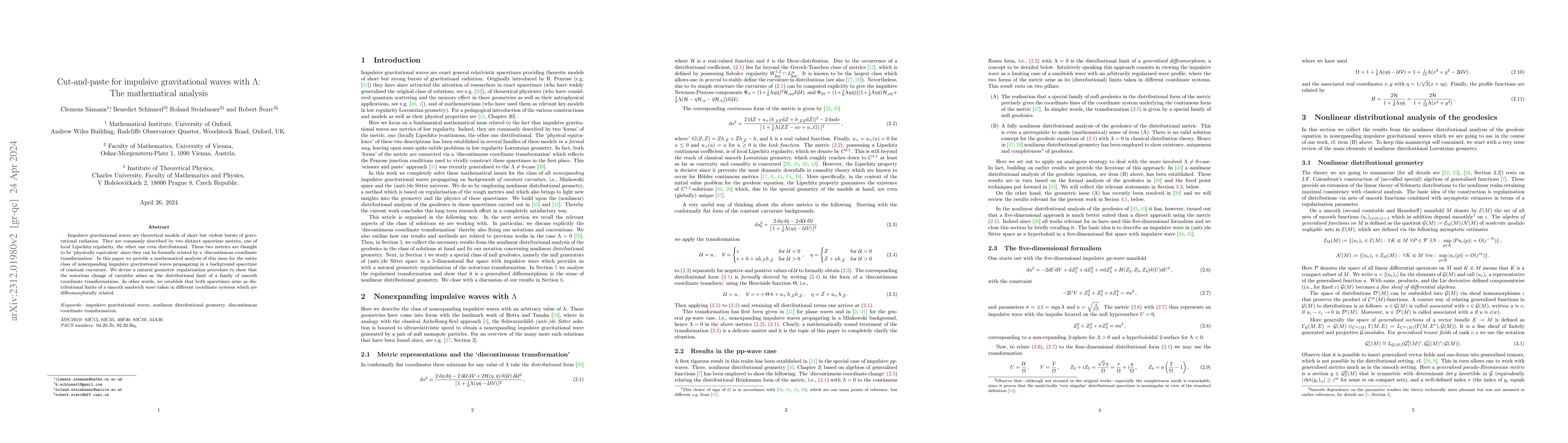 This paper mathematically analyzes impulsive gravitational waves, showing their equivalence through a geometric regularization process. It demonstrates that both the local Lipschitz and distributional spacetime metrics arise as limits of smooth coordinate transformations, establishing their physical equivalence.