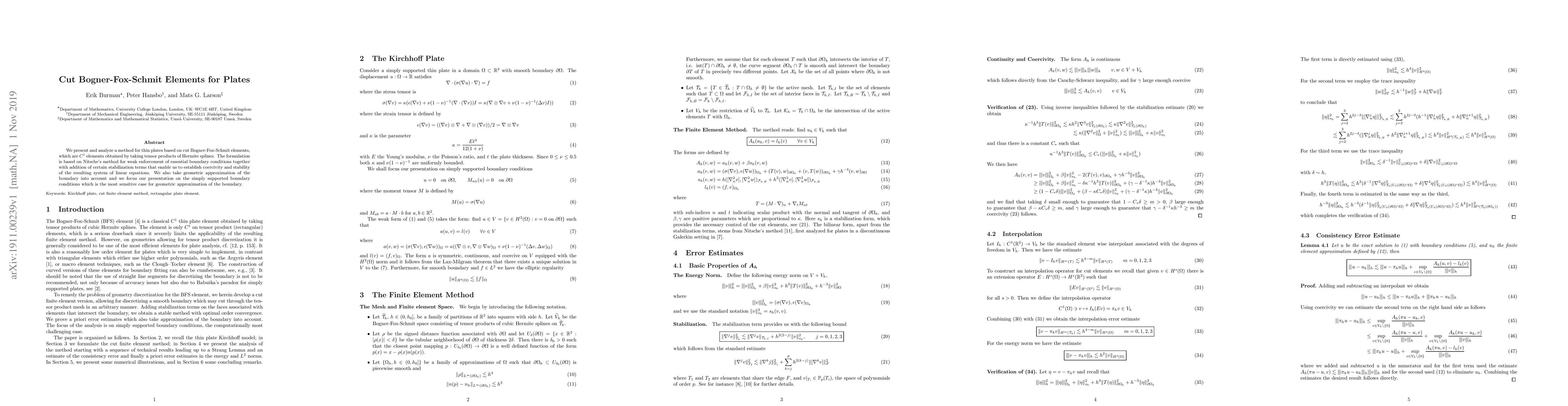 This paper introduces a method for thin plate analysis using cut Bogner-Fox-Schmit elements, which are $C^1$ elements derived from Hermite splines. The approach employs Nitsche's method for weak enforcement of boundary conditions and stabilization terms to ensure system stability and coercivity.