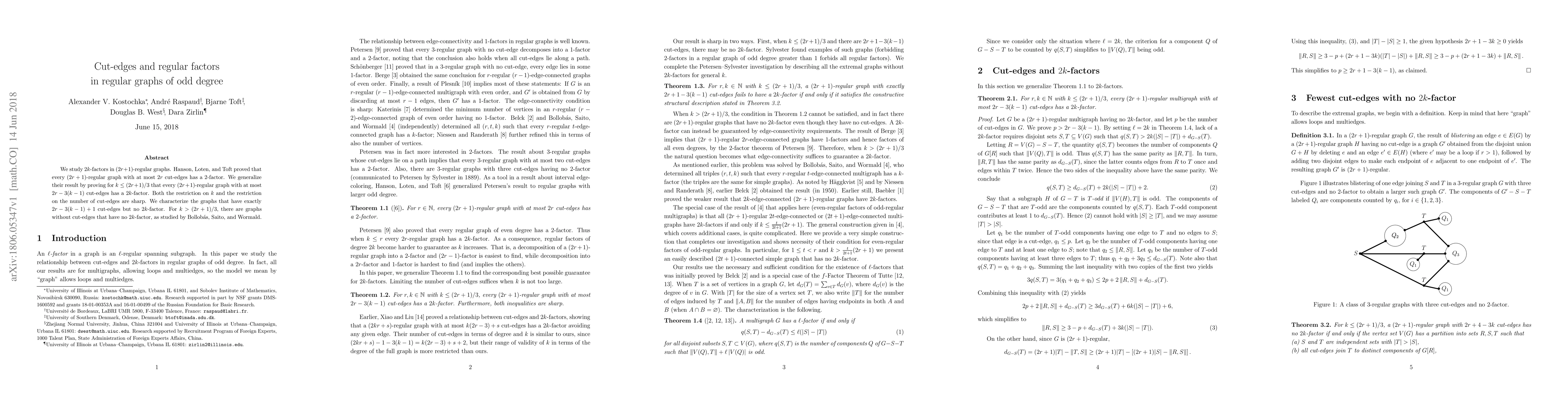 The paper introduces a new theorem generalizing the existence of $2k$-factors in $(2r+1)$-regular graphs with specific constraints on cut-edges and $k$, along with a characterization of extremal graphs.