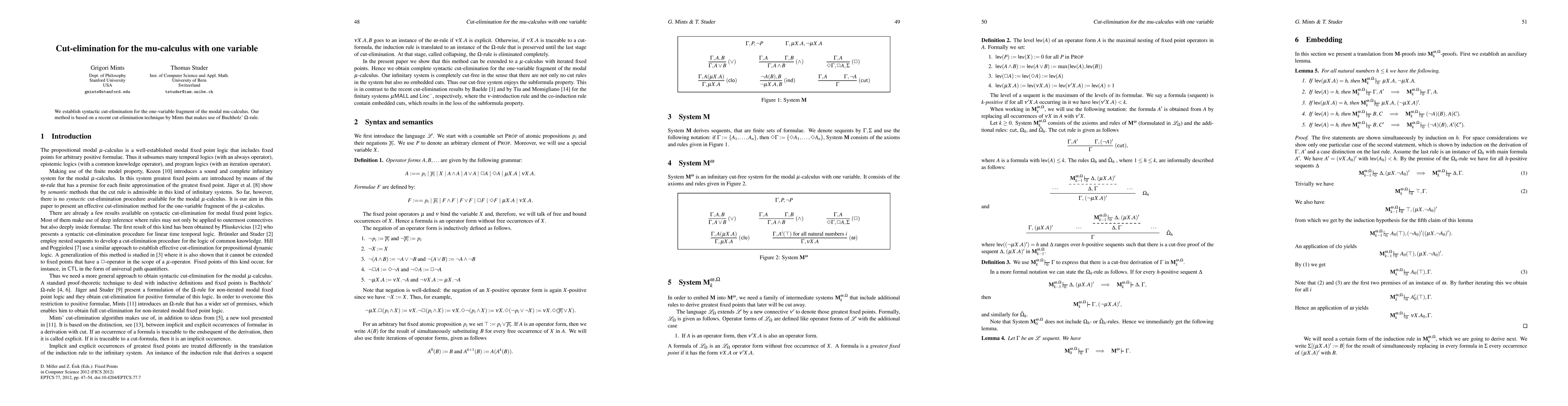 Summary: This paper proves syntactic cut-elimination for the one-variable fragment of the modal mu-calculus using Mints' technique, which incorporates Buchholz' Omega-rule. This result enhances the understanding of the structural properties of the mu-calculus.