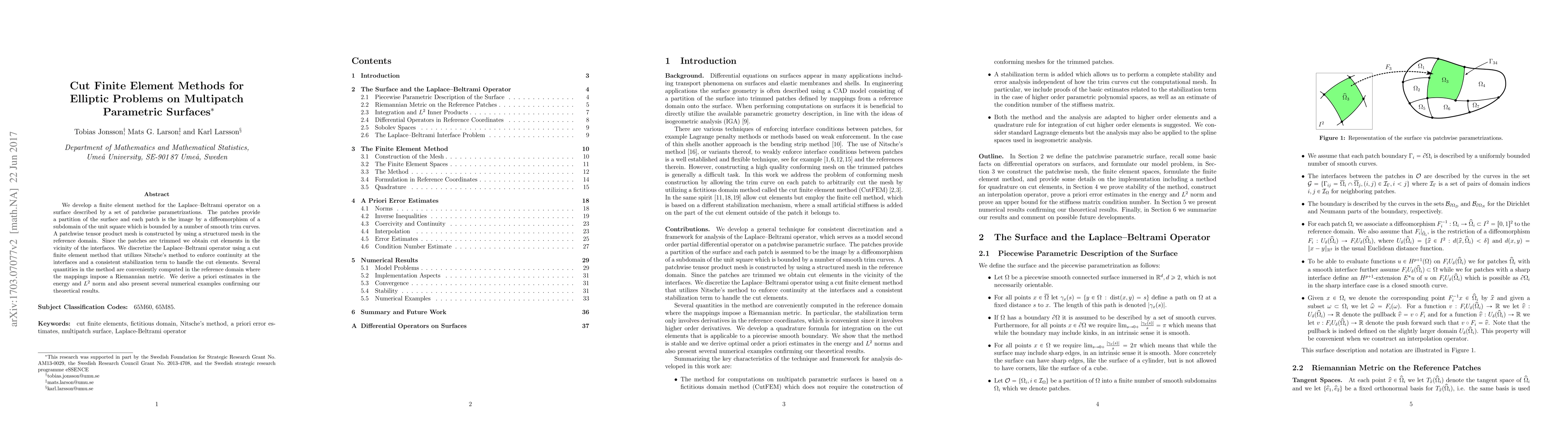 We develop a finite element method for the Laplace--Beltrami operator on a surface described by a set of patchwise parametrizations. The patches provide a partition of the surface and each patch is the image by a diffeomorphism of a subdomain of the unit square which is bounded by a number of smooth trim curves. A patchwise tensor product mesh is constructed by using a structured mesh in the reference domain. Since the patches are trimmed we obtain cut elements in the vicinity of the interfaces. We discretize the Laplace--Beltrami operator using a cut finite element method that utilizes Nitsche's method to enforce continuity at the interfaces and a consistent stabilization term to handle the cut elements. Several quantities in the method are conveniently computed in the reference domain where the mappings impose a Riemannian metric. We derive a priori estimates in the energy and $L^2$ norm and also present several numerical examples confirming our theoretical results.