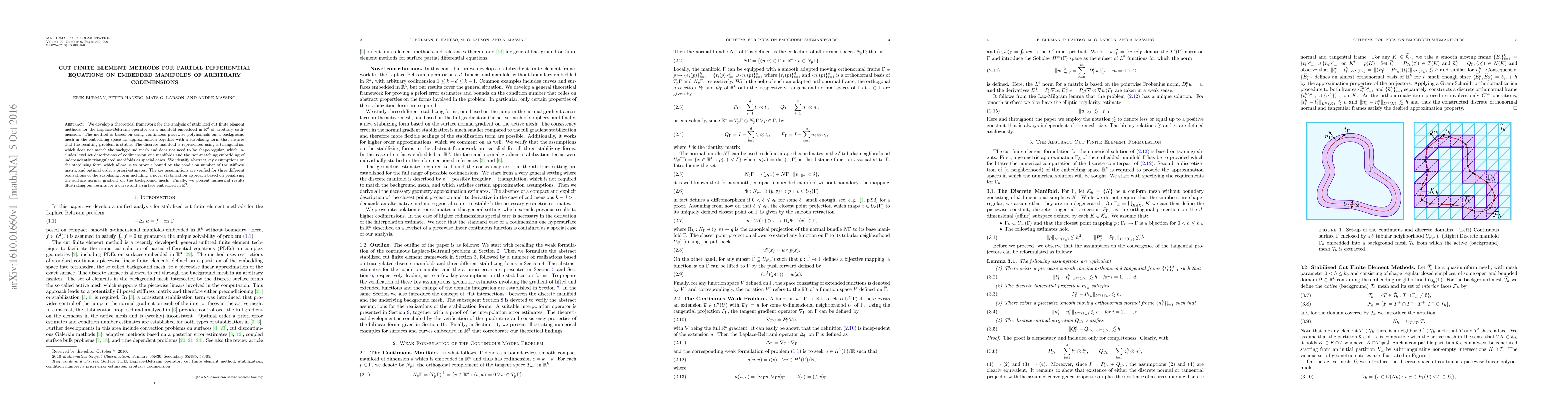 We develop a theoretical framework for the analysis of stabilized cut finite element methods for the Laplace-Beltrami operator on a manifold embedded in $\mathbb{R}^d$ of arbitrary codimension. The method is based on using continuous piecewise polynomials on a background mesh in the embedding space for approximation together with a stabilizing form that ensures that the resulting problem is stable. The discrete manifold is represented using a triangulation which does not match the background mesh and does not need to be shape-regular, which includes level set descriptions of codimension one manifolds and the non-matching embedding of independently triangulated manifolds as special cases. We identify abstract key assumptions on the stabilizing form which allow us to prove a bound on the condition number of the stiffness matrix and optimal order a priori estimates. The key assumptions are verified for three different realizations of the stabilizing form including a novel stabilization approach based on penalizing the surface normal gradient on the background mesh. Finally, we present numerical results illustrating our results for a curve and a surface embedded in $\mathbb{R}^3$.