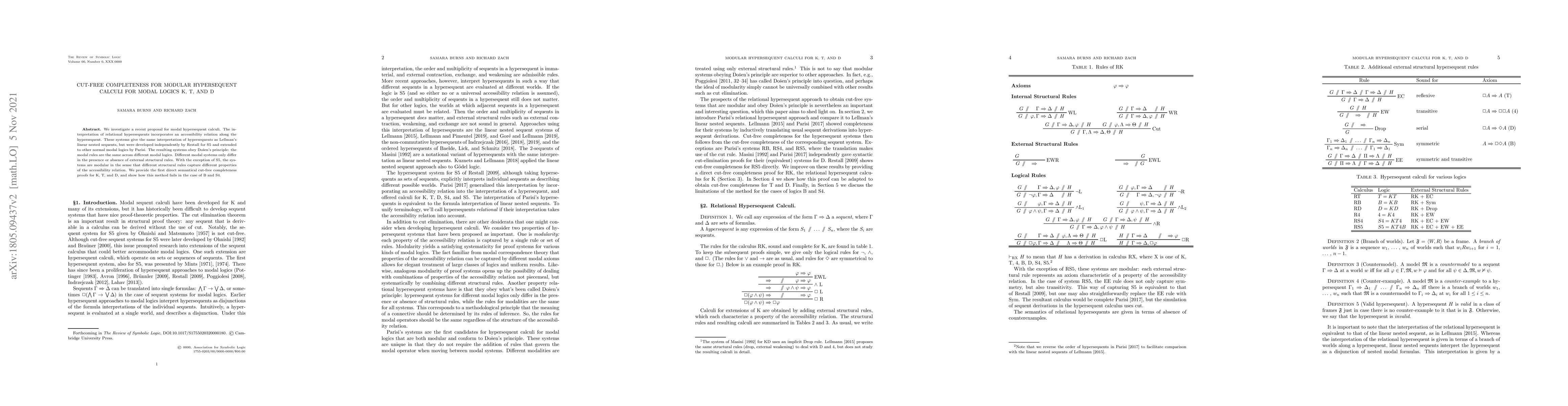 This paper presents a direct semantical proof of cut-free completeness for modular hypersequent calculi for the modal logics K, T, and D, demonstrating that these systems effectively capture different modal properties through varying structural rules. The method fails for B and S4, highlighting the unique completeness of K, T, and D.