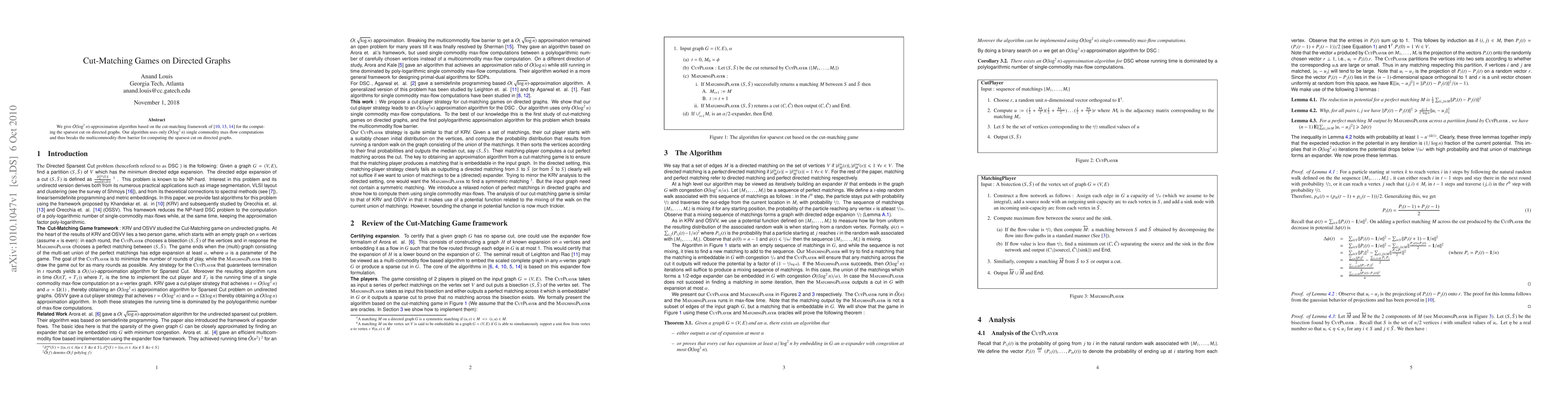 This paper presents an O(log^2 n)-approximation algorithm for computing the sparsest cut on directed graphs using the cut-matching framework, requiring only O(log^2 n) single commodity max-flow computations, thus overcoming the multicommodity-flow barrier.