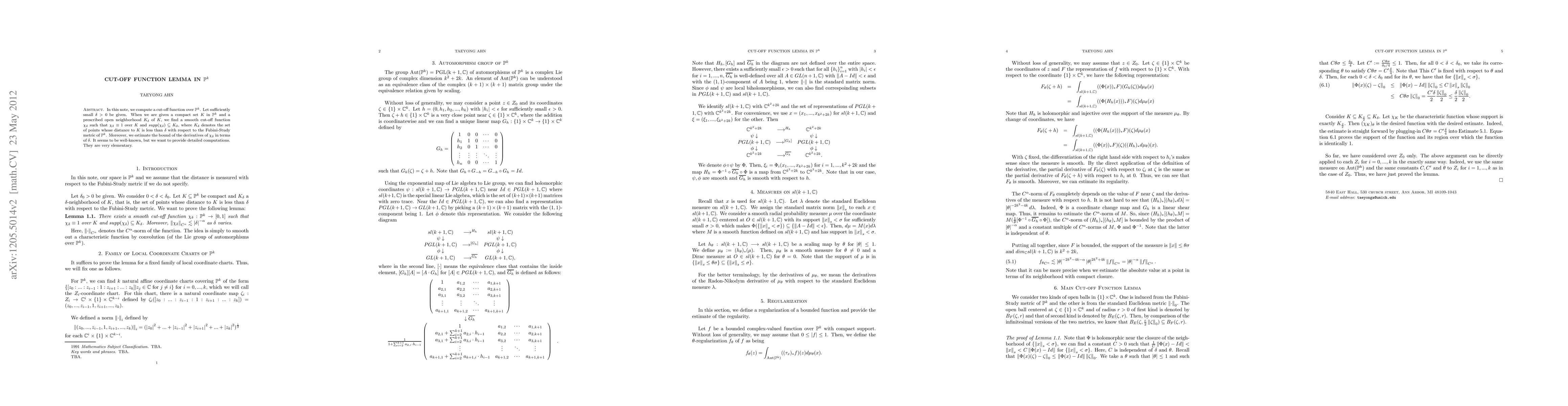 Summary: This paper details a cut-off function lemma in projective spaces, providing a comprehensive computation that is presumed to be well-known but is included for future reference and utility.