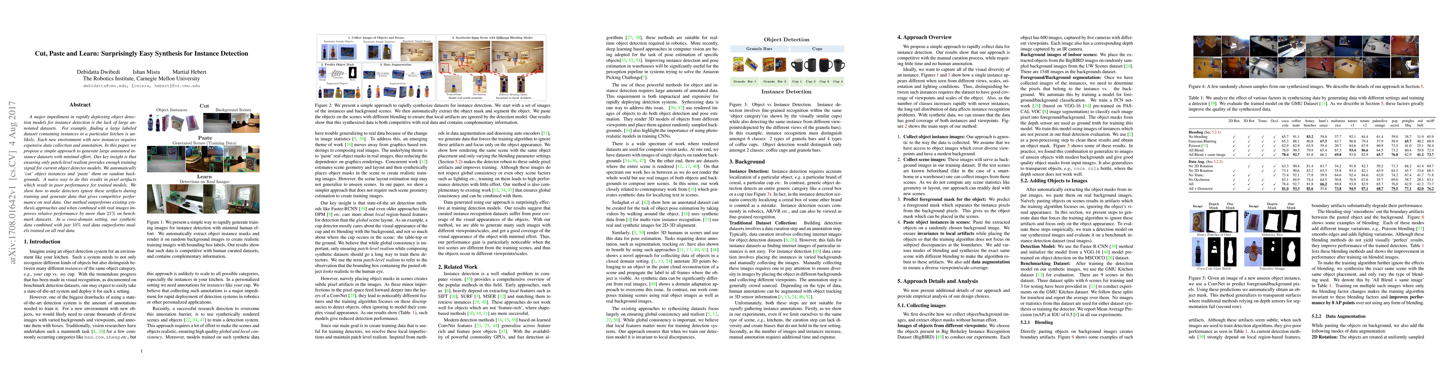 A major impediment in rapidly deploying object detection models for instance detection is the lack of large annotated datasets. For example, finding a large labeled dataset containing instances in a particular kitchen is unlikely. Each new environment with new instances requires expensive data collection and annotation. In this paper, we propose a simple approach to generate large annotated instance datasets with minimal effort. Our key insight is that ensuring only patch-level realism provides enough training signal for current object detector models. We automatically `cut' object instances and `paste' them on random backgrounds. A naive way to do this results in pixel artifacts which result in poor performance for trained models. We show how to make detectors ignore these artifacts during training and generate data that gives competitive performance on real data. Our method outperforms existing synthesis approaches and when combined with real images improves relative performance by more than 21% on benchmark datasets. In a cross-domain setting, our synthetic data combined with just 10% real data outperforms models trained on all real data.