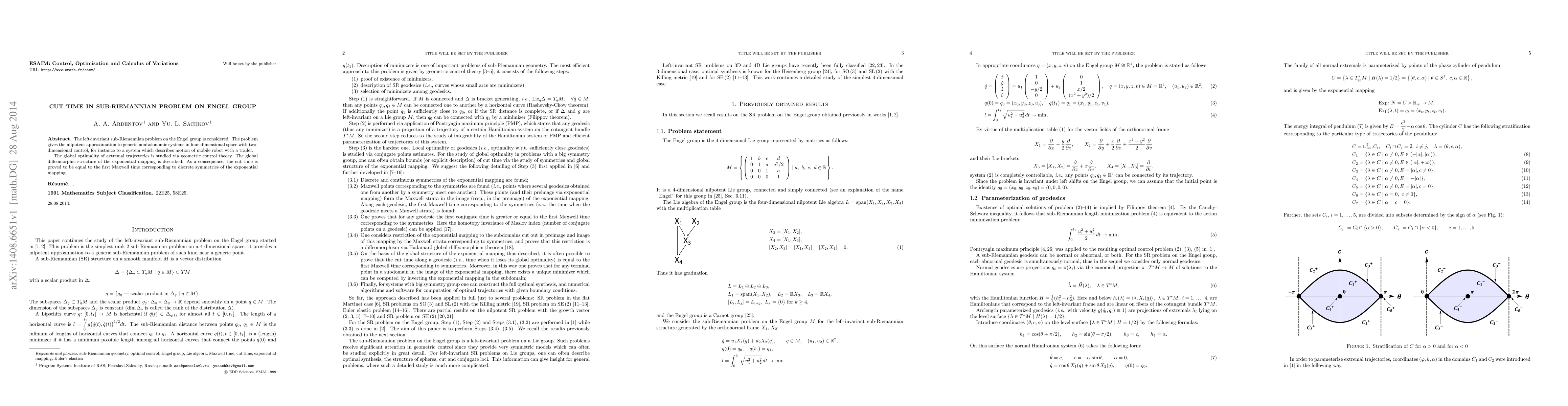 The left-invariant sub-Riemannian problem on the Engel group is considered. The problem gives the nilpotent approximation to generic nonholonomic systems in four-dimensional space with two-dimensional control, for instance to a system which describes motion of mobile robot with a trailer. The global optimality of extremal trajectories is studied via geometric control theory. The global diffeomorphic structure of the exponential mapping is described. As a consequence, the cut time is proved to be equal to the first Maxwell time corresponding to discrete symmetries of the exponential mapping.