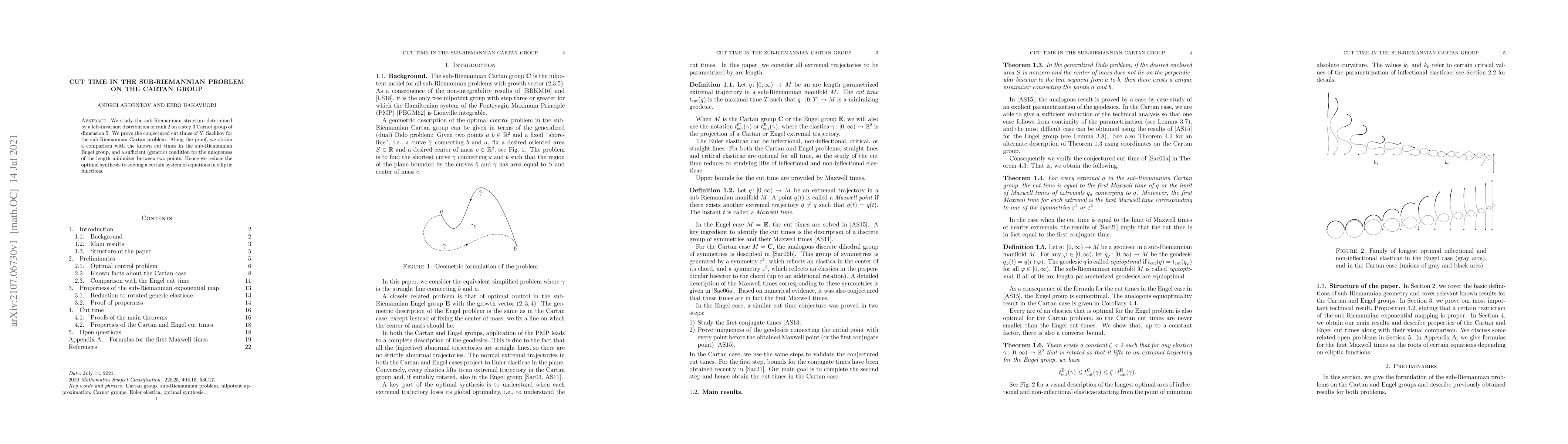 We study the sub-Riemannian structure determined by a left-invariant distribution of rank 2 on a step 3 Carnot group of dimension 5. We prove the conjectured cut times of Y. Sachkov for the sub-Riemannian Cartan problem. Along the proof, we obtain a comparison with the known cut times in the sub-Riemannian Engel group, and a sufficient (generic) condition for the uniqueness of the length minimizer between two points. Hence we reduce the optimal synthesis to solving a certain system of equations in elliptic functions.