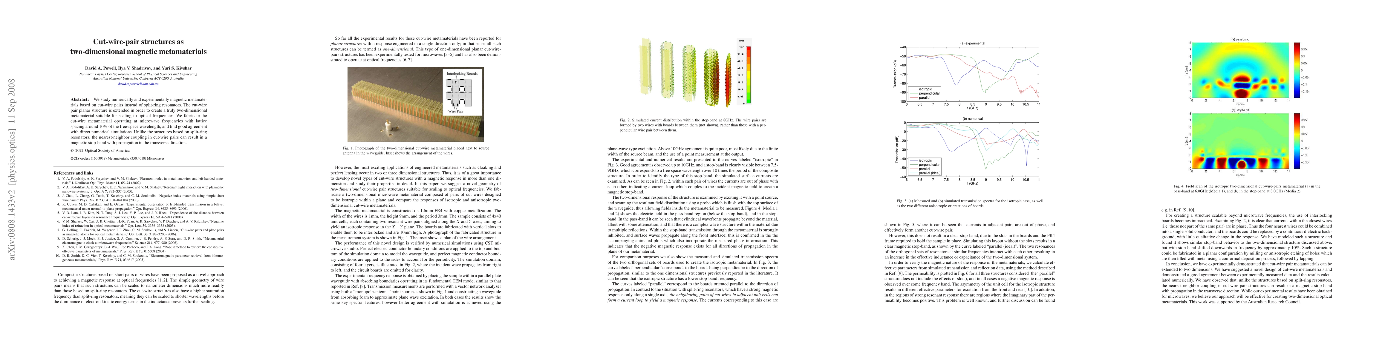 This paper investigates cut-wire pair structures as two-dimensional magnetic metamaterials, demonstrating their potential for scaling to optical frequencies. Experimental and numerical results show good agreement, highlighting the magnetic stop-band enabled by nearest-neighbor coupling in cut-wire pairs.